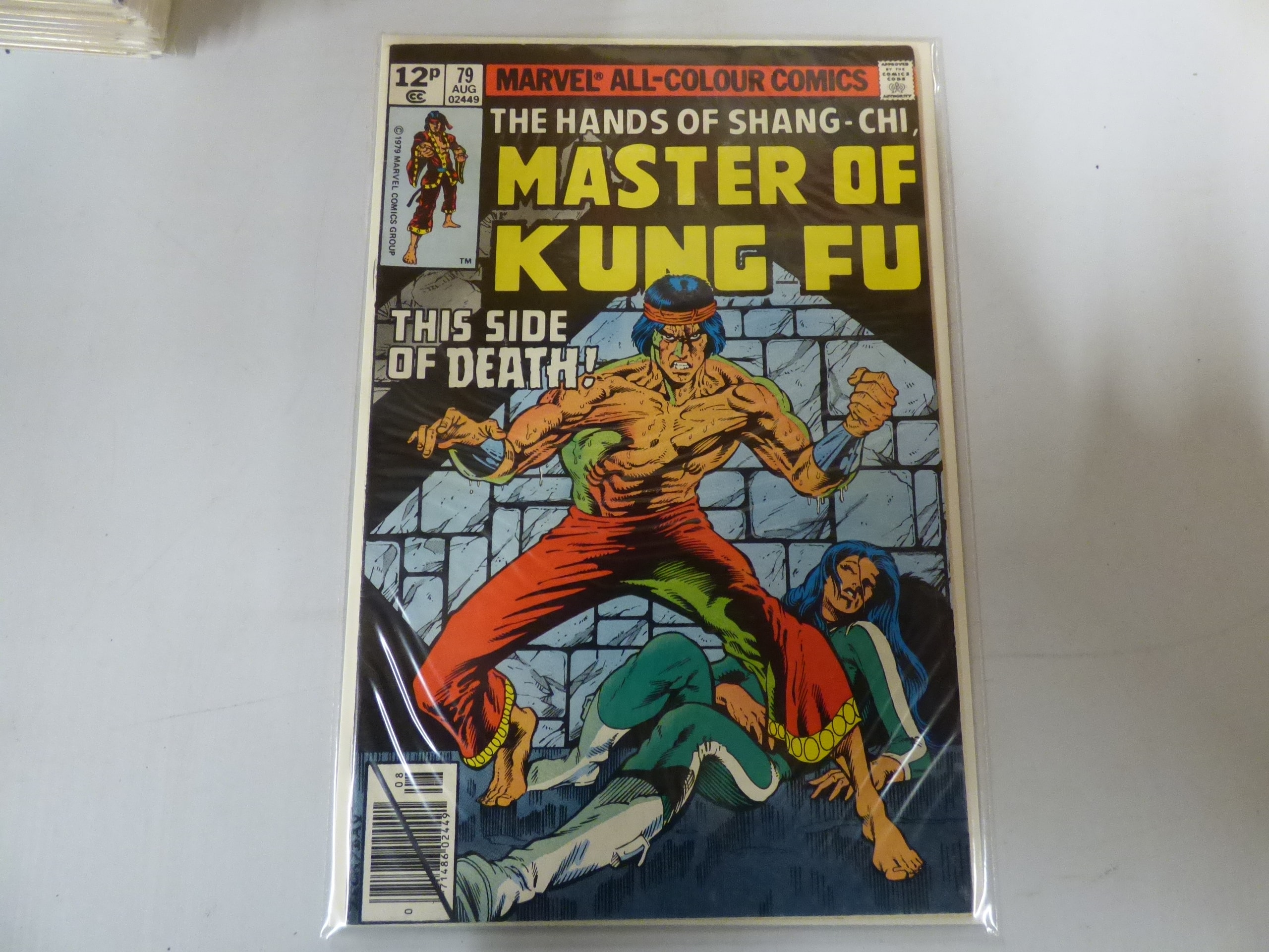 A MARVEL® ALL-COLOUR COMICS issue #79 from August 1979, titled ‘THE HANDS OF SHANG-CHI, MASTER OF KUNG FU, THIS SIDE OF DEATH!’, displaying a multi-colored cover with black, yellow, red, and green hues, marked ‘© 1979 MARVEL COMICS GROUP’, ‘APPROVED BY THE COMICS CODE AUTHORITY’, and a price of 12P.