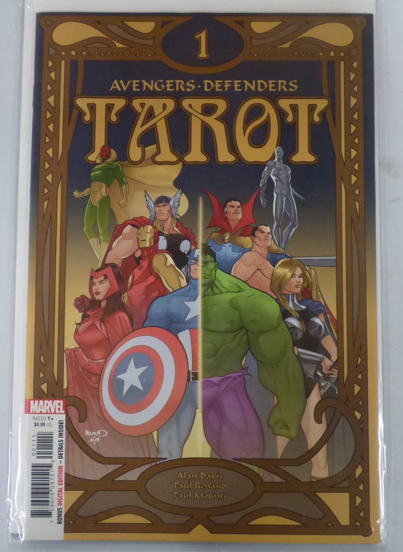 A Marvel comic book titled “AVENGERS DEFENDERS TAROT” #1, featuring a colorful cover with numerous superheroes, rated T+, priced at $4.99 US, and includes a bonus digital edition.