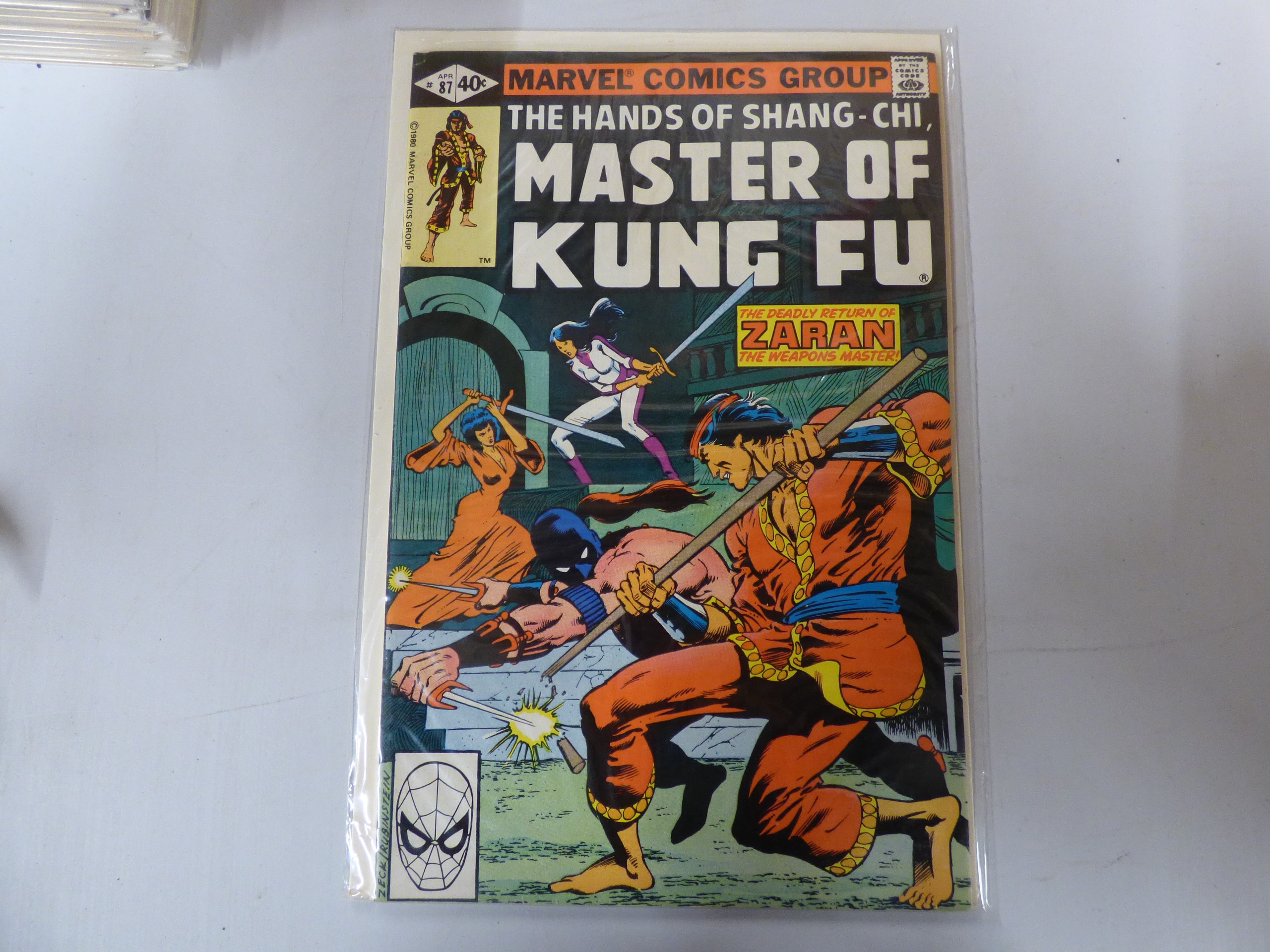 A Marvel Comics Group comic book, issue #87 of “THE HANDS OF SHANG-CHI, MASTER OF KUNG FU, ” priced at 40¢, ©1980, featuring characters in orange, white, blue, and black against a dark background, with the tagline “THE DEADLY RETURN OF ZARAN THE WEAPONS MASTER!” and an “APPROVED BY THE COMICS CODE AUTHORITY” seal.