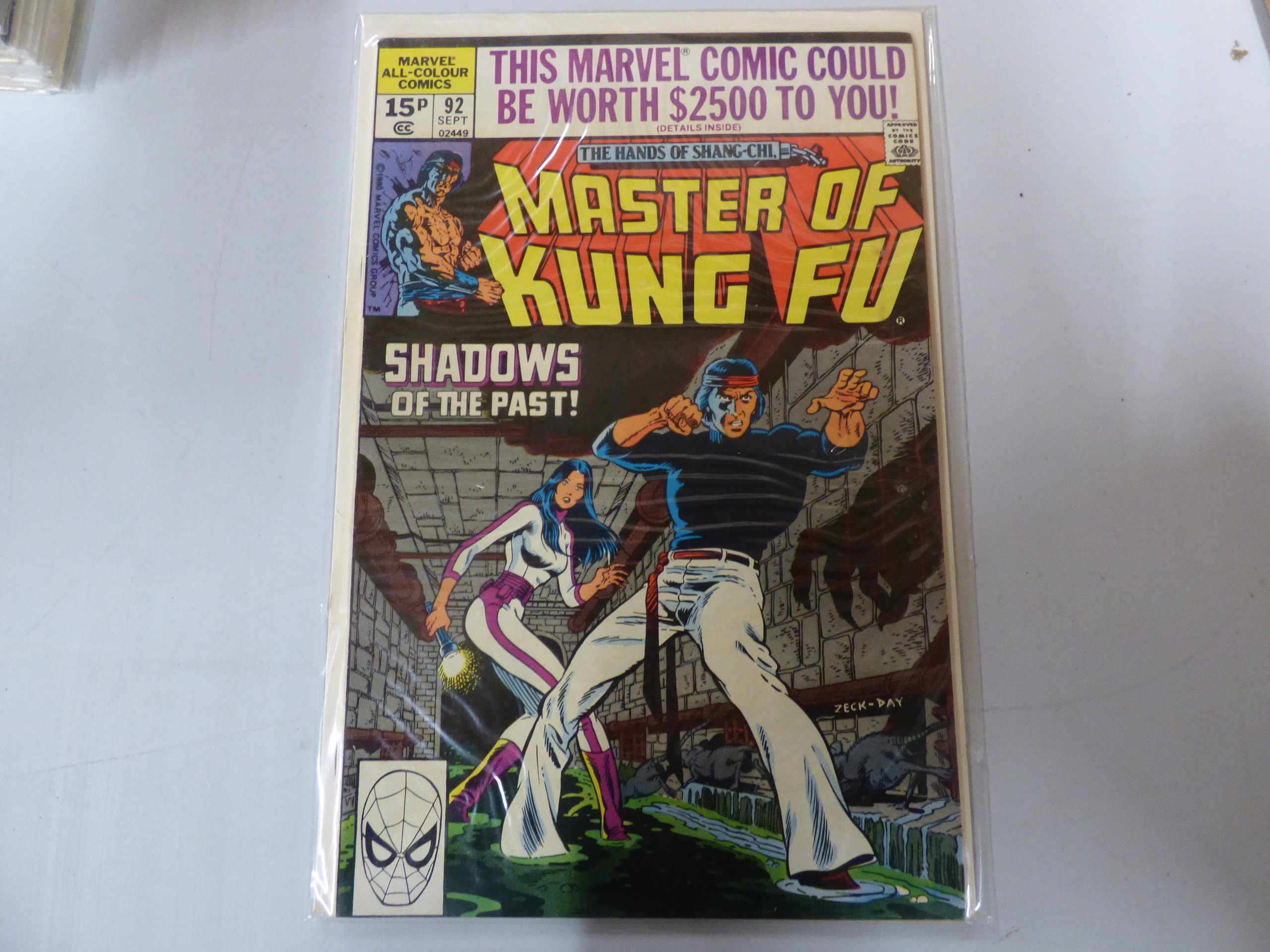 A Marvel Master of Kung Fu comic book, issue 92 from September 1980, featuring Shang-Chi and another character in action on the cover with prominent red, yellow, black, white, and purple hues, marked “15P” and “SHADOWS OF THE PAST!”.