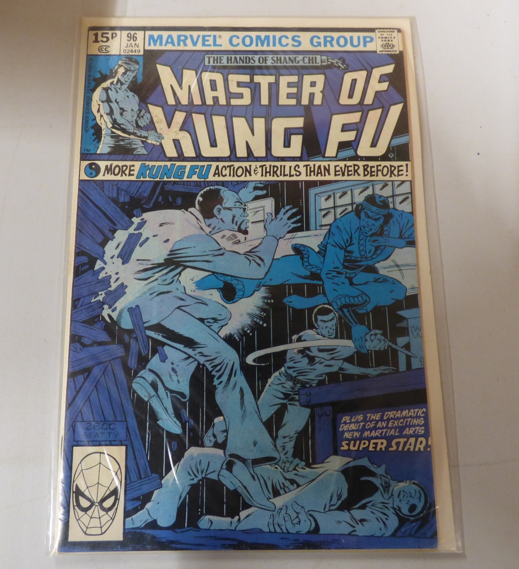 A comic book, “Master of Kung Fu” #96, published by Marvel Comics Group in January 1980, featuring Shang-Chi, in blue, white, and black, with a 15P cover price.
