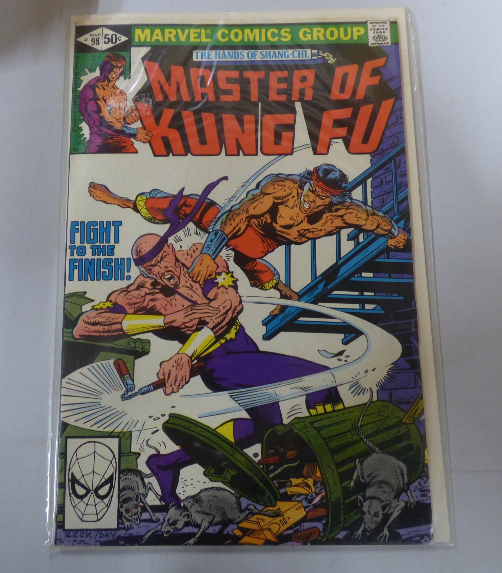 A multi-coloured Marvel Comics Group ‘Master of Kung Fu’ #98 comic book, titled ‘The Hands of Shang-Chi, ‘ copyrighted ©1980, with art by ZECK / DAY, originally priced at 50¢.
