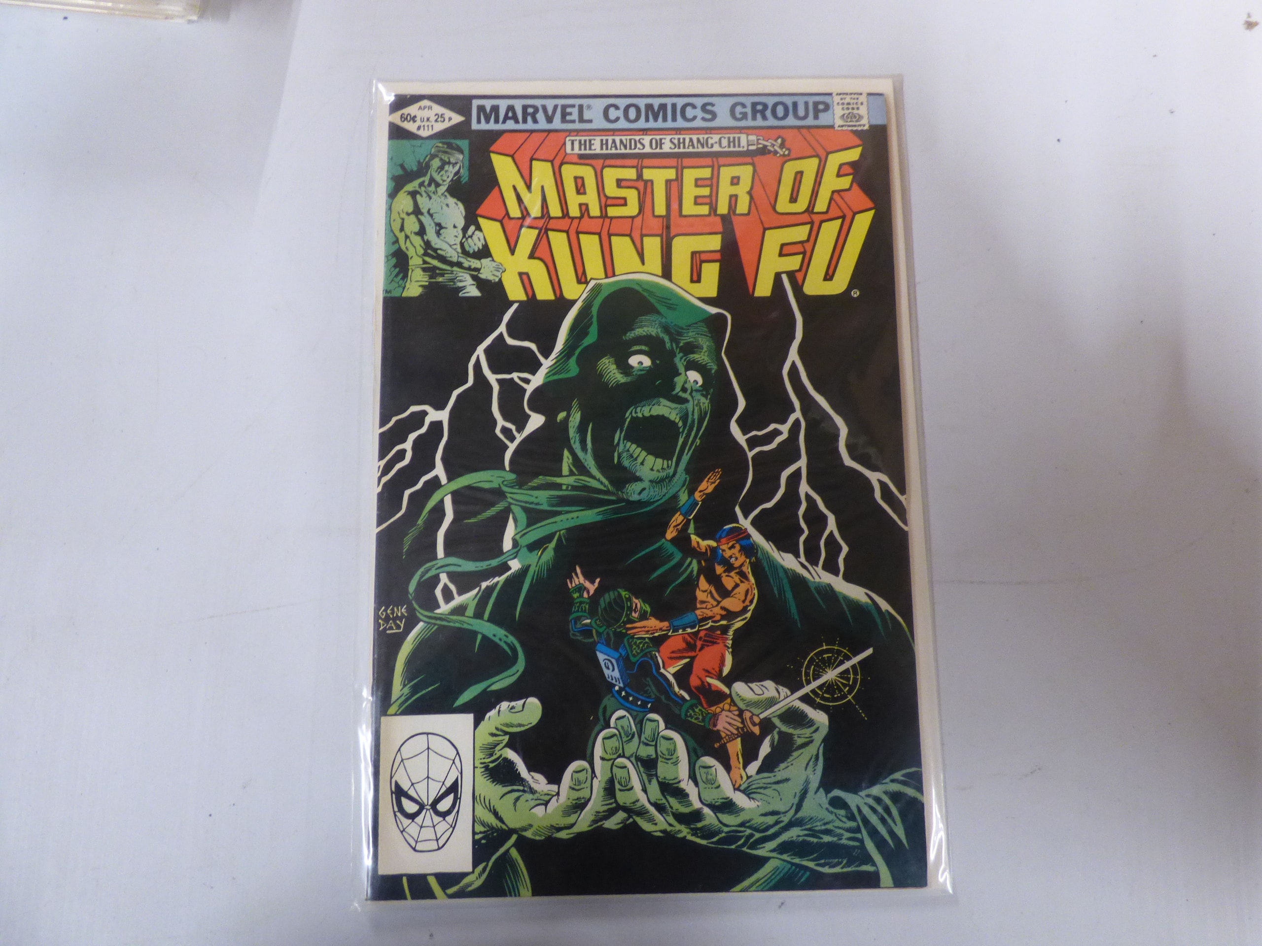 A Marvel Comics Group comic book, issue #111, titled ‘The Hands of Shang-Chi, Master of Kung Fu’, features a predominantly black cover with a large green hooded figure, smaller colorful martial arts characters, a ‘GENE DAY’ signature, and a Spider-Man logo, originally priced at 60¢.