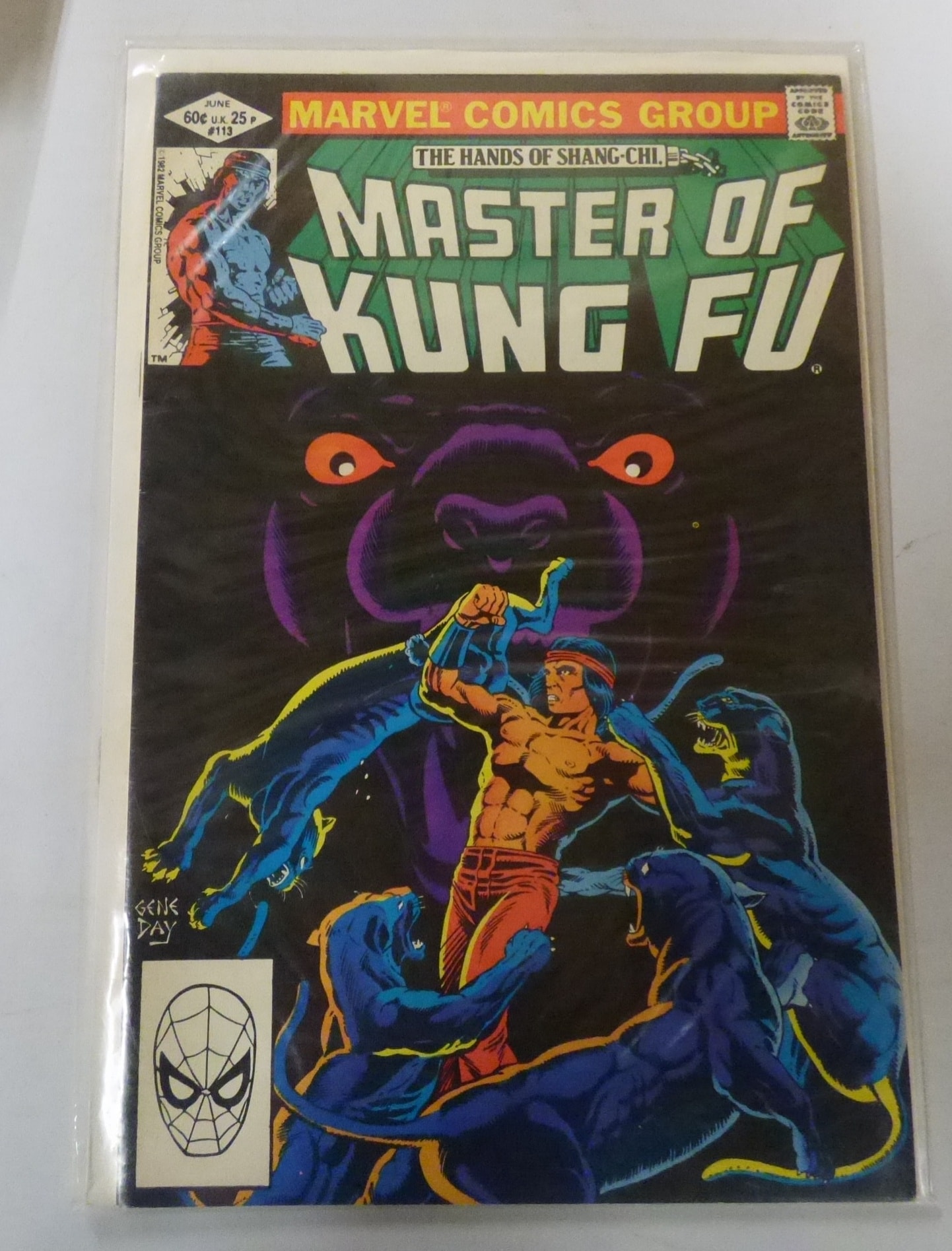 A Marvel Comics Group ‘Master of Kung Fu’ comic book, issue #113 from June 1982, featuring a black, green, orange, blue, and purple cover depicting Shang-Chi fighting panthers, marked 60¢ (U.K. 25P), with a Spider-Man logo and Gene Day signature.