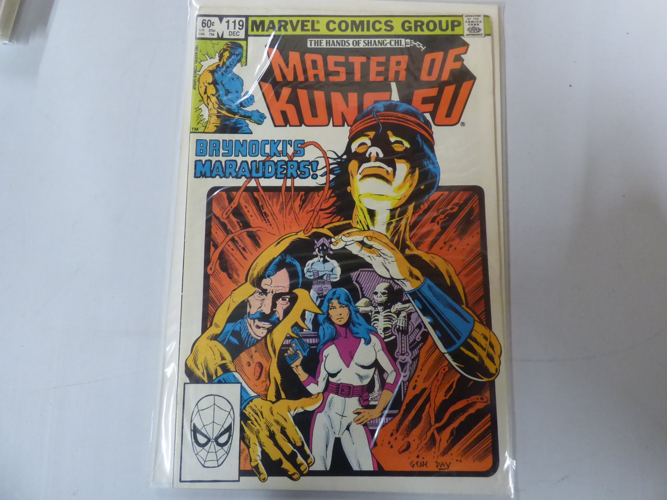 A Marvel comic book titled “MASTER OF KUNG-FU, ” issue #119 from December, featuring a multi-colored cover displaying characters in action, priced at 60¢, with visible text including “MARVEL® COMICS GROUP, ” “THE HANDS OF SHANG-CHI, ” “BRYNOCKI’S MARAUDERS!, ” a Spider-Man logo, and art by Gene Day.