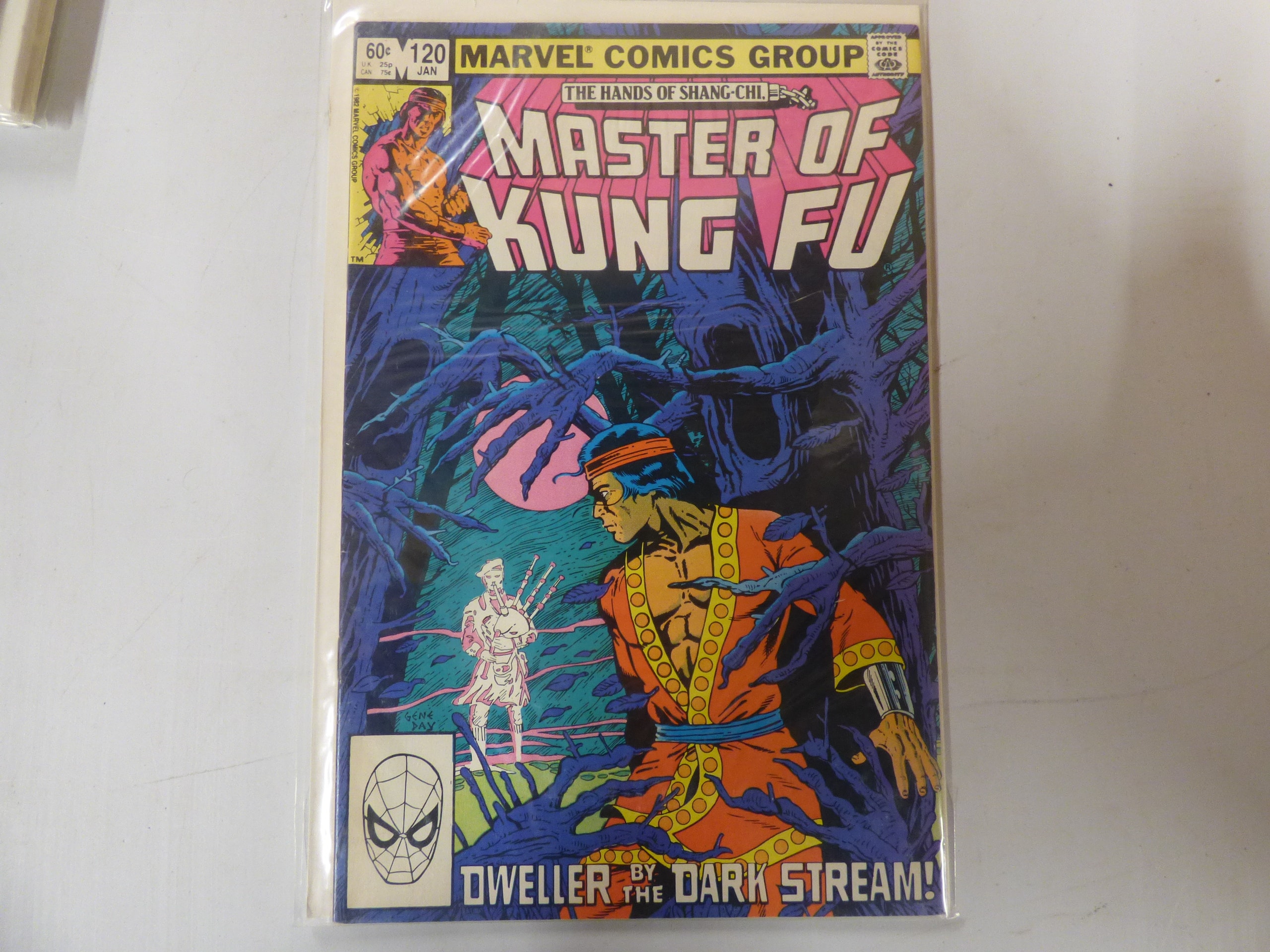 A multi-color Marvel Comics Group comic book titled “Master of Kung Fu” (The Hands of Shang-Chi) issue #120 from January 1982, featuring the story “Dweller by the Dark Stream!” and artwork by Gene Day.