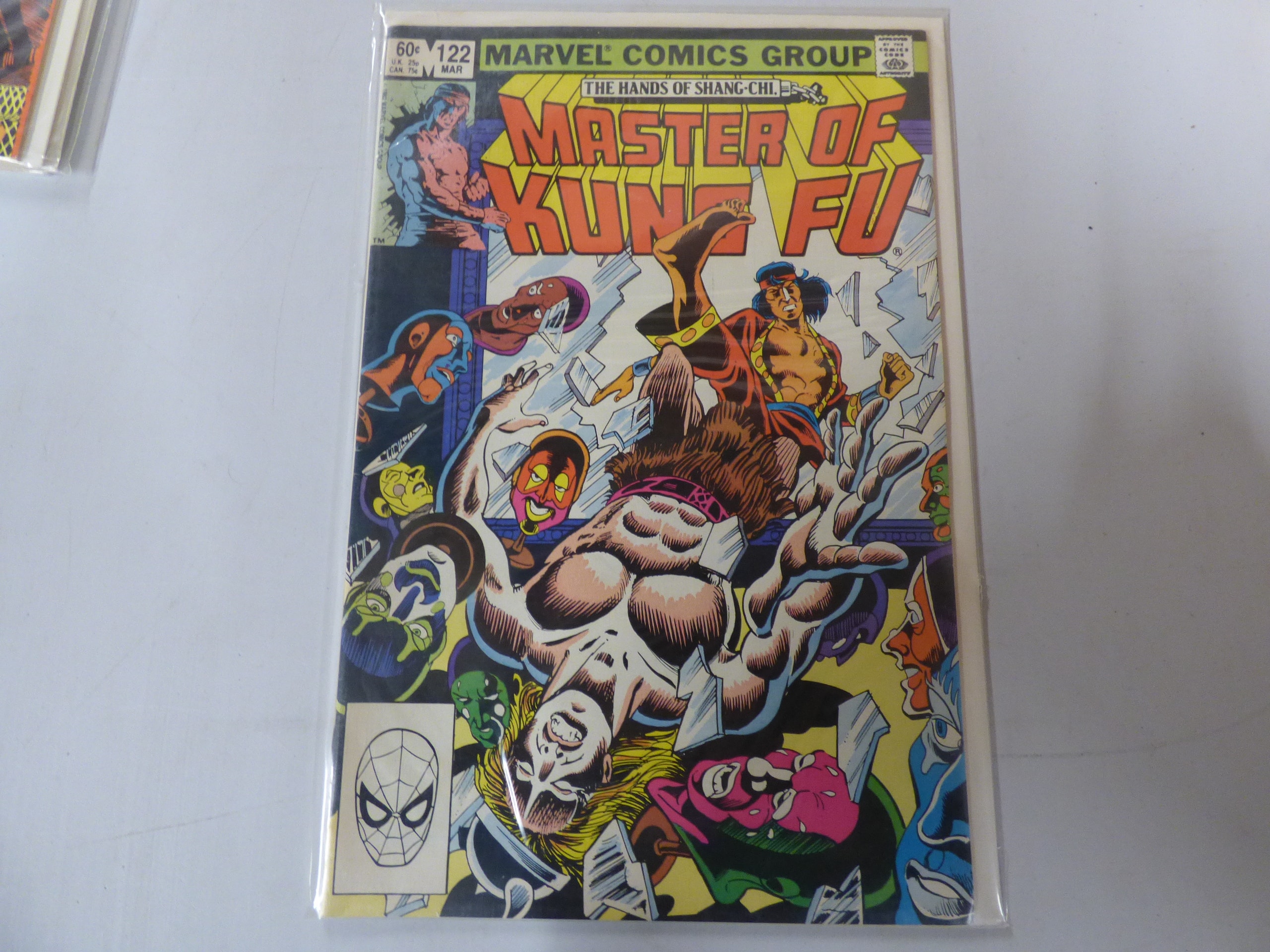 A Marvel comic book, “Master of Kung Fu” issue #122 from March, featuring a colorful action cover with several characters, priced at 60¢, and including “Marvel Comics Group”, “The Hands of Shang-Chi” titles, an “Approved by the Comics Code Authority” seal, and a Spider-Man logo.