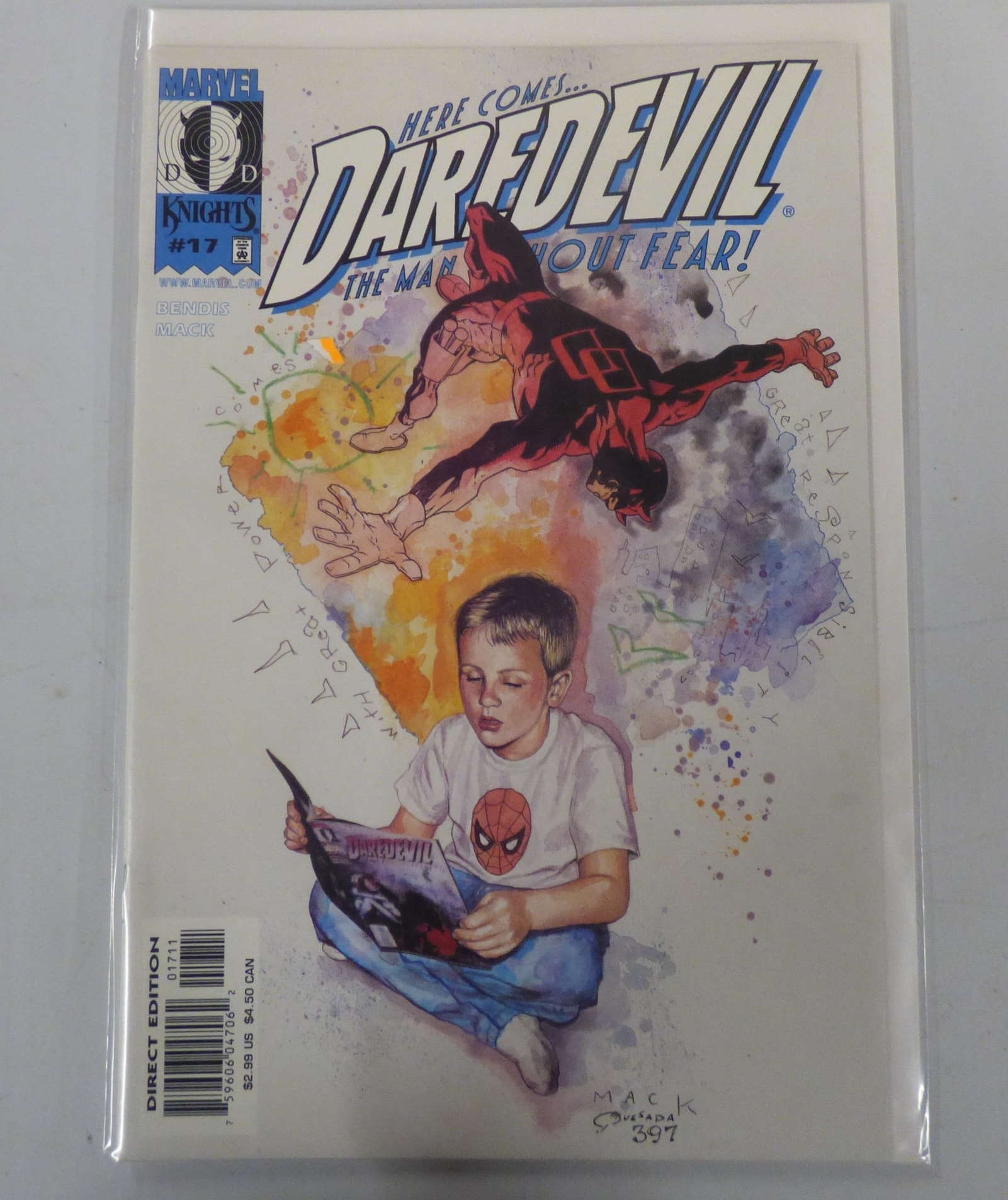 A Marvel Knights Daredevil comic book, issue #17, primarily white with red, blue, and orange cover art, marked ‘DIRECT EDITION’ and ‘$2.99 US’.
