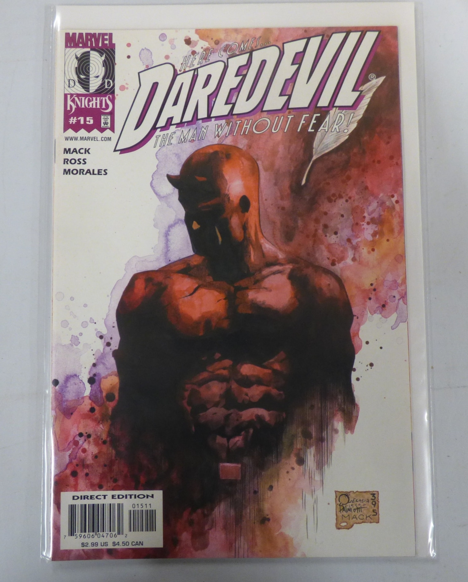 A comic book, predominantly red, purple, and black on a white background, identified as ‘MARVEL DAREDEVIL THE MAN WITHOUT FEAR! #15 DIRECT EDITION’ with creators MACK ROSS MORALES and artists QUEÑADA PAIMOTT MACK, originally priced at $2.99 US.