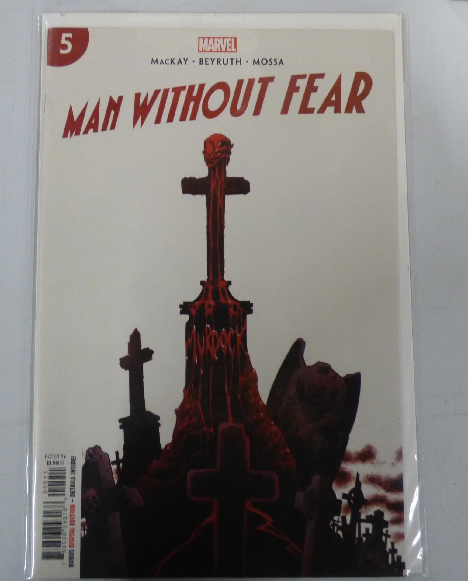 A Marvel comic book titled “MAN WITHOUT FEAR” #5, featuring a light grey, red, and dark brown cover depicting gravestones, one inscribed “MURDOCK, ” rated T+.