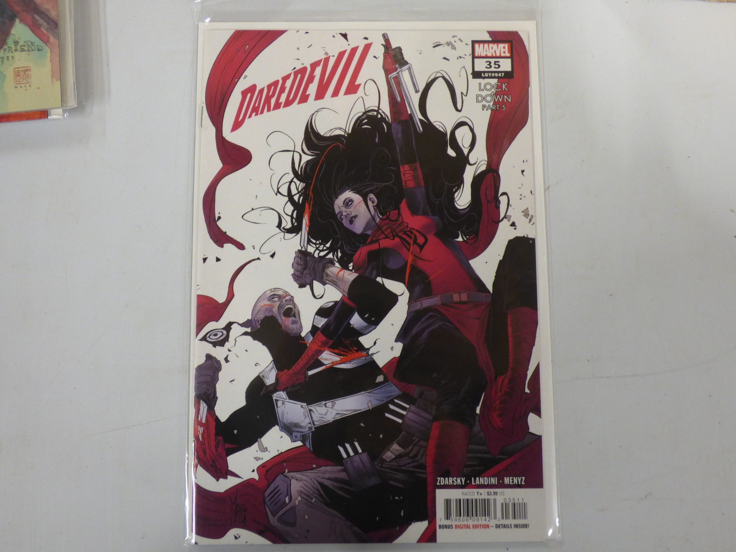 A Marvel “DAREDEVIL” comic book, issue #35 (LGY#647), titled “LOCK DOWN PART 5,” featuring red, black, and white artwork by ZDARSKY • LANDINI • MENYZ, rated T+, and priced at $3.99 US, with a bonus digital edition.
