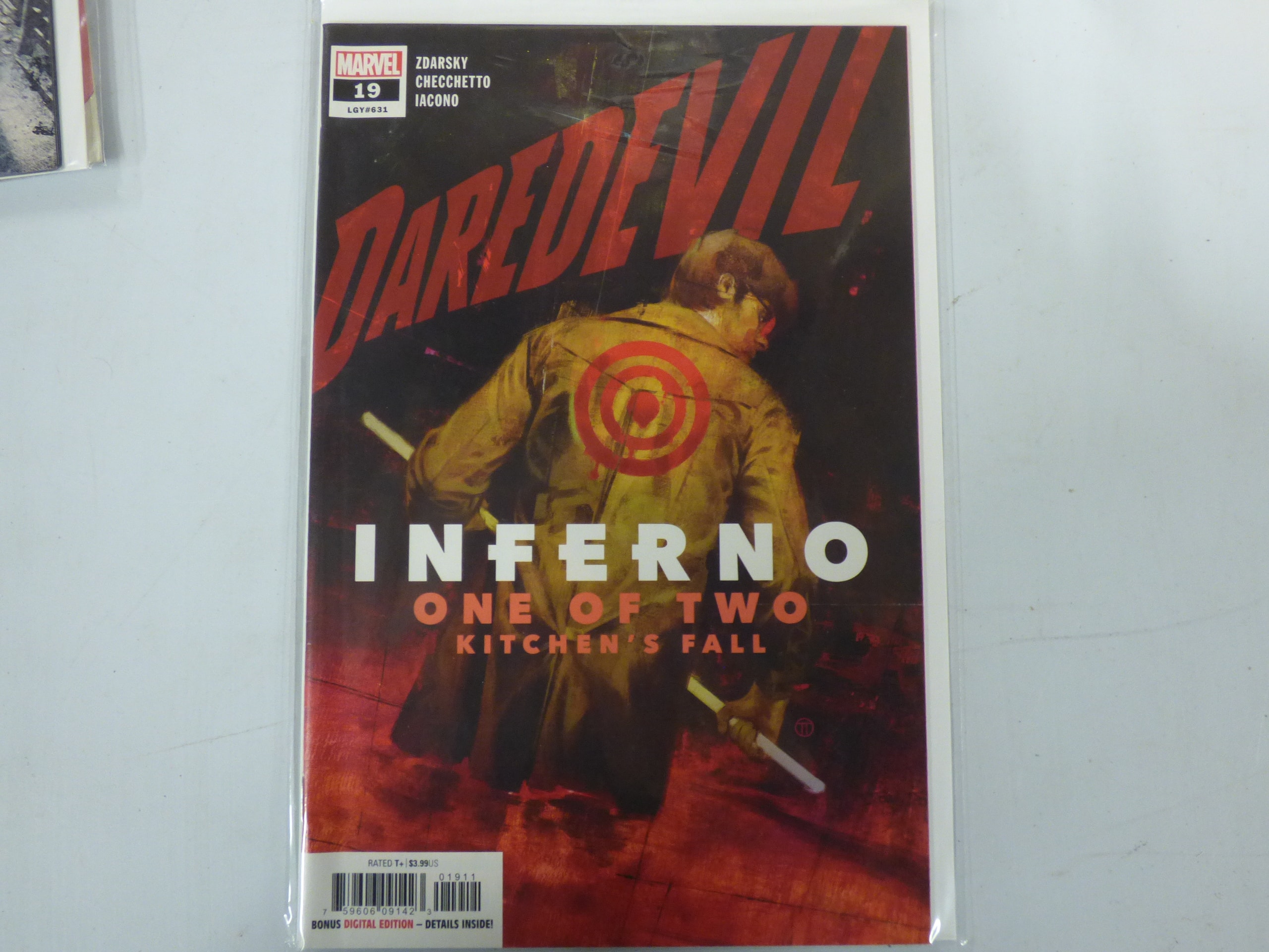 A MARVEL DAREDEVIL issue #19 comic book with a dark gray/black cover, red lettering, and a figure in a yellowish-brown coat, featuring “INFERNO ONE OF TWO KITCHEN’S FALL” text and a $3.99US price.