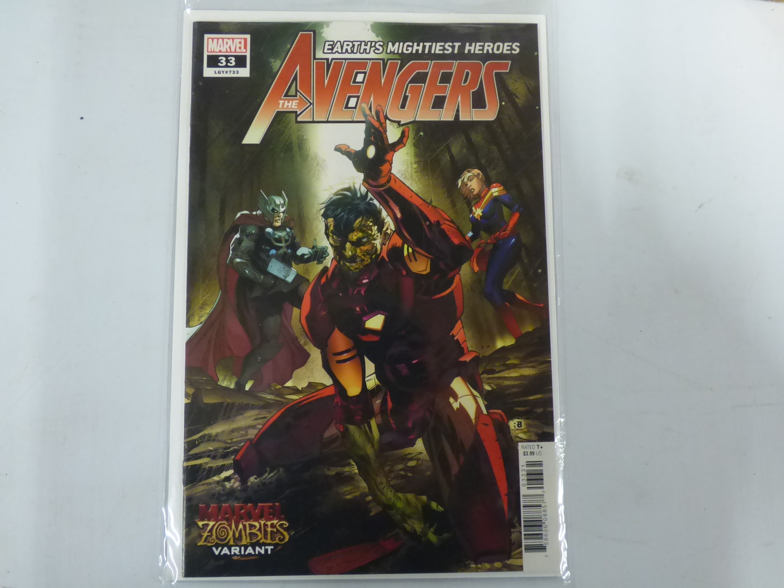 A Marvel comic book, ‘The Avengers’ #33 (LGY#733) with a ‘MARVEL ZOMBIES VARIANT’ cover featuring zombie Iron Man, Thor, and Captain Marvel in red, green, blue, and dark tones.
