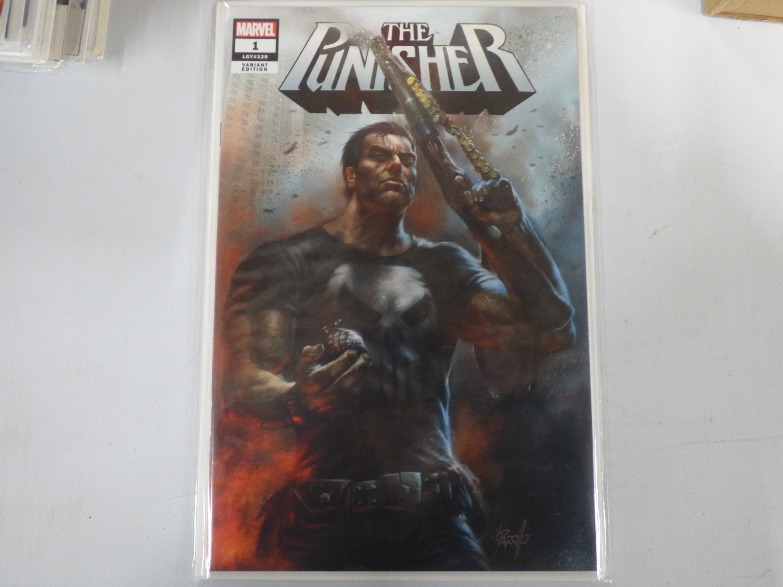 A Marvel comic book, ‘The Punisher’ #1, Variant Edition, featuring the Punisher holding a rifle and grenade, in black, dark grey, blue, and orange colors, with artist’s signature ‘R. Barro’.
