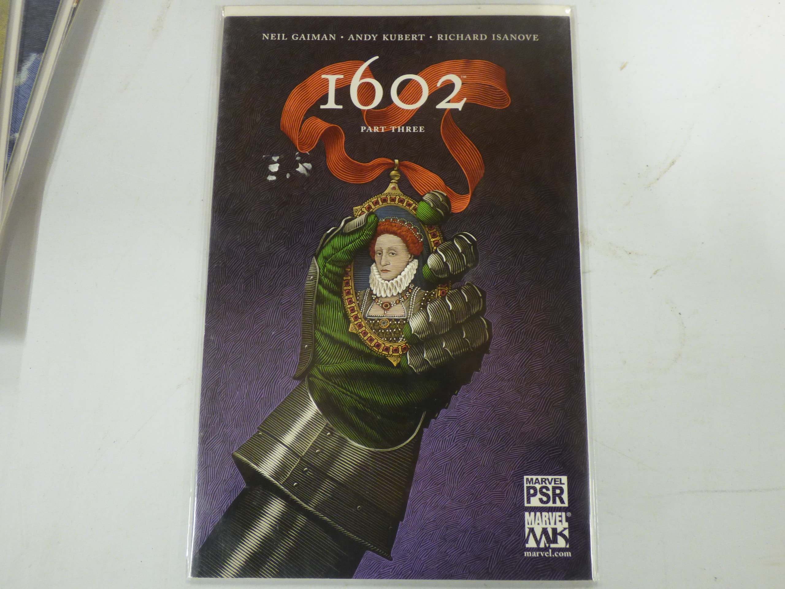 A comic book, primarily dark purple, green, and orange, titled “1602 Part Three, ” featuring artwork by Neil Gaiman, Andy Kubert, and Richard Isanove, with Marvel PSR and Marvel MK branding, and “marvel.com” text.