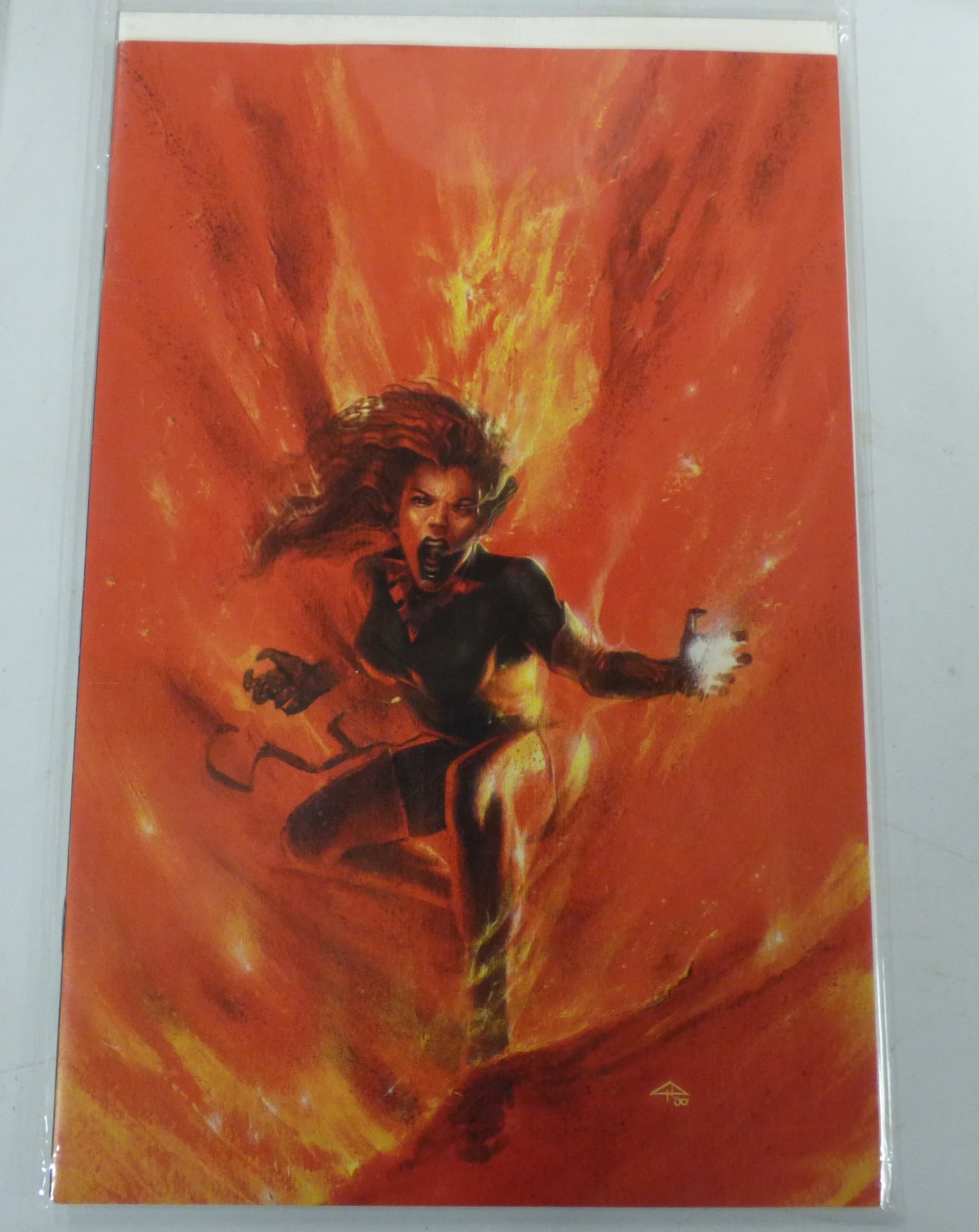 A comic book featuring a female figure with fiery red hair and dark clothing, engulfed in red and orange flames, with a stylized golden signature/mark.