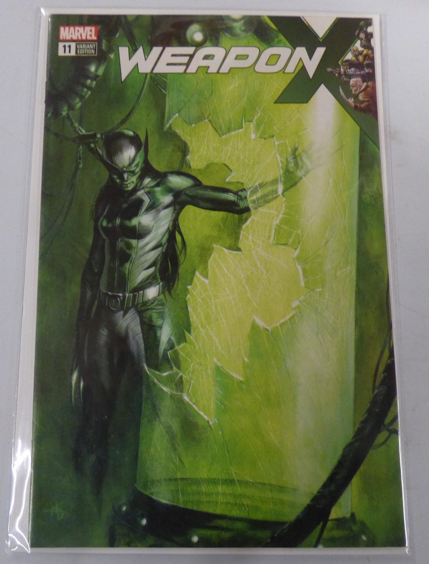A Marvel “Weapon X” issue #11 Variant Edition comic book, predominantly green and black with white text, depicting a character in a green and black suit emerging from a green, cracked container.