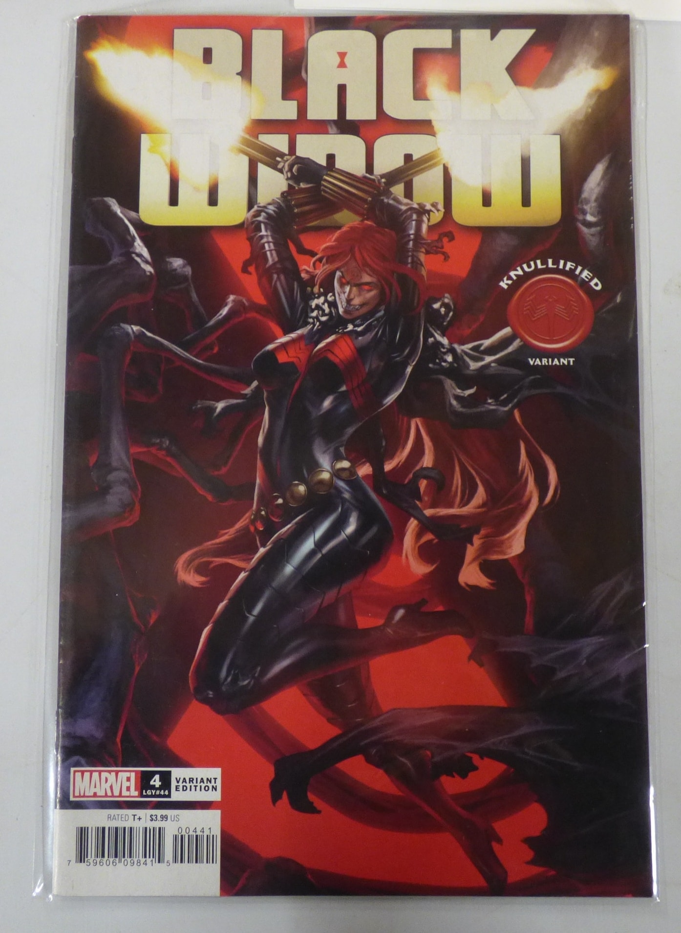 A Black Widow Marvel comic book, issue #4 (LGY#44) Knullified Variant Edition, featuring the character Black Widow in red and black, rated T+, and priced at $3.99 US.