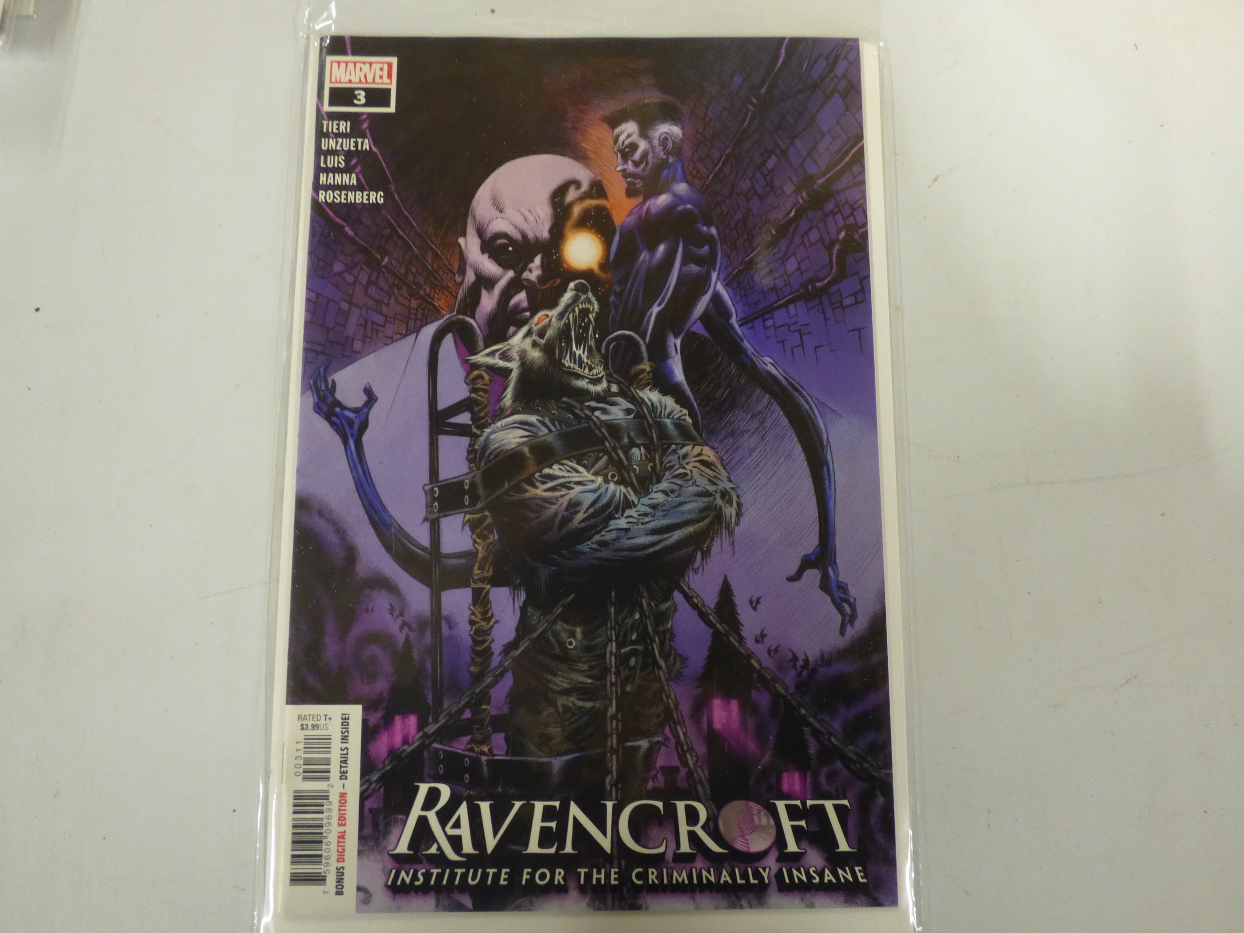 One Marvel comic book, “Ravencroft Institute for the Criminally Insane #3,” by Tieri, Unzueta, Luis, Hanna, and Rosenberg, features a purple and dark blue color scheme, is rated T+, and includes a bonus digital edition.