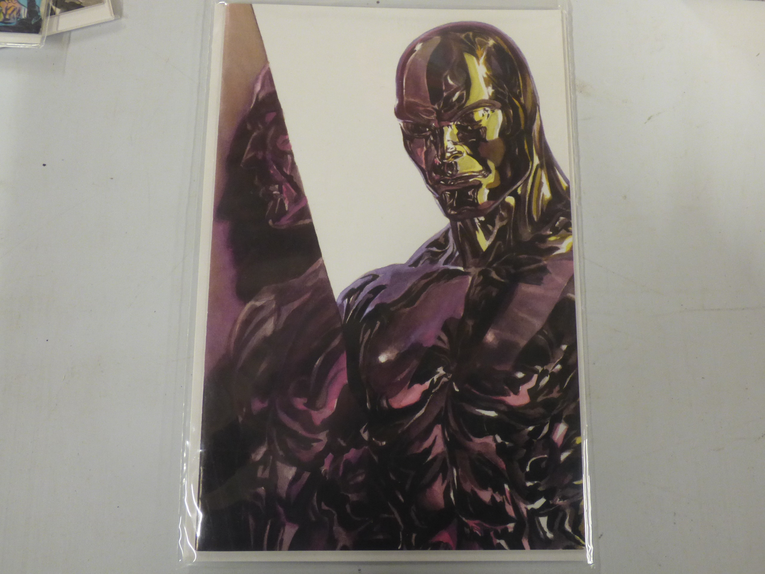 A comic book featuring a metallic purple and bronze humanoid figure with a gold-hued face on a white background, identified as Fantastic Four Antithesis #2 Alex Ross Silver Surfer Variant.