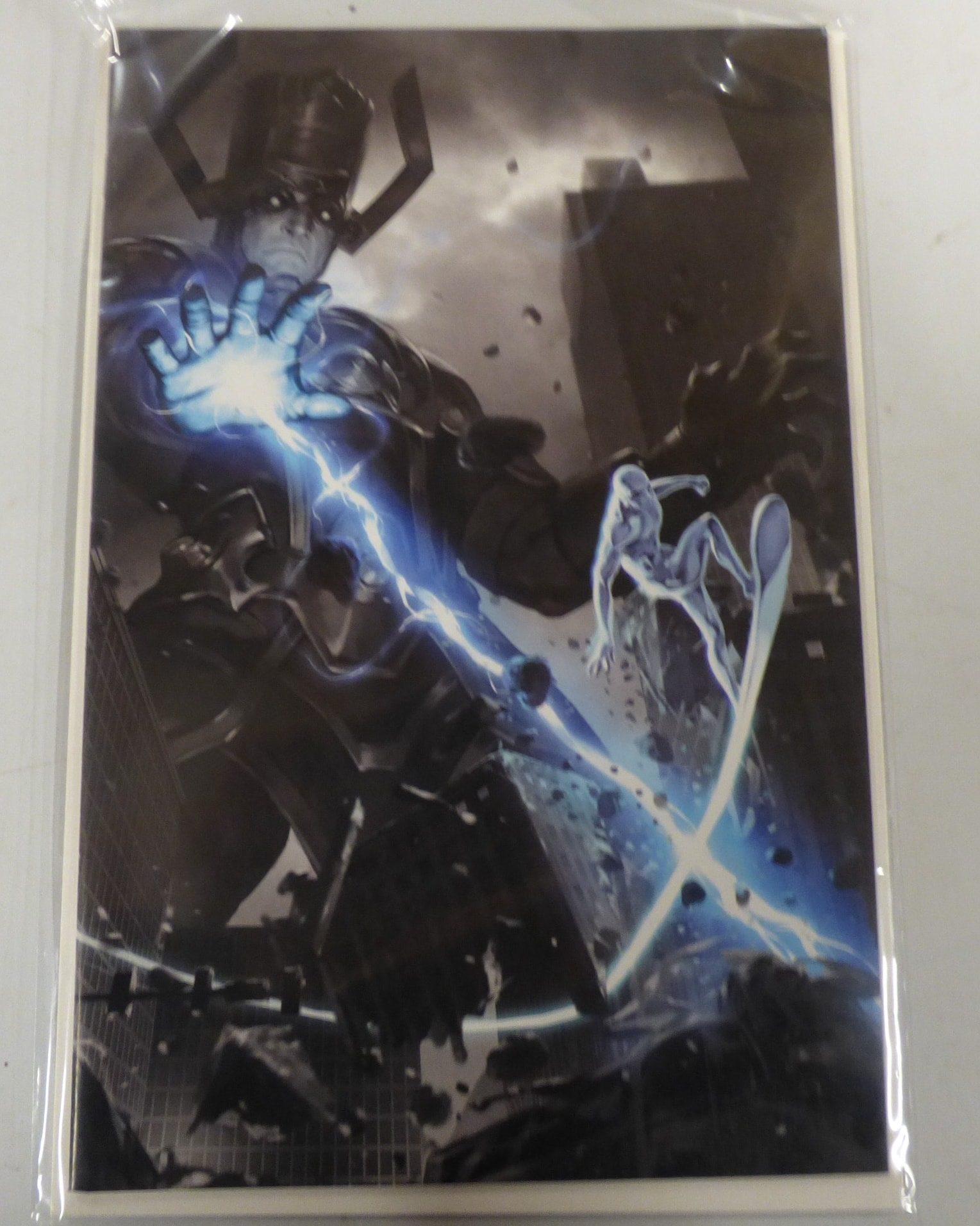 A comic book featuring Galactus in dark armour and a silver-coloured Silver Surfer, primarily in dark blue, black, silver, and light blue colours.
