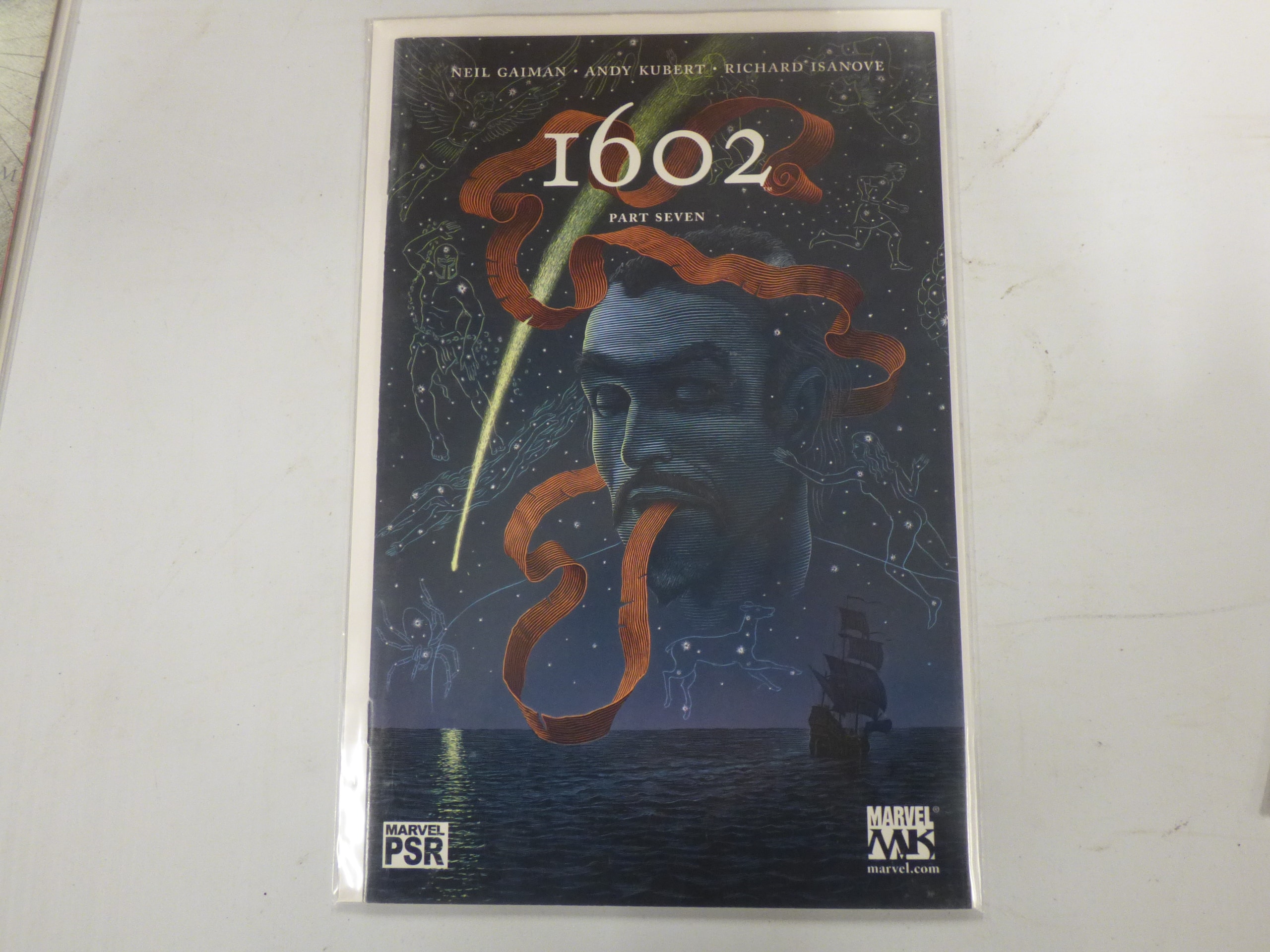 A comic book, primarily dark blue/black, depicting a large blue face with an orange ribbon and constellations, titled “1602 PART SEVEN” by Neil Gaiman, Andy Kubert, and Richard Isanove, published by Marvel in 2004.