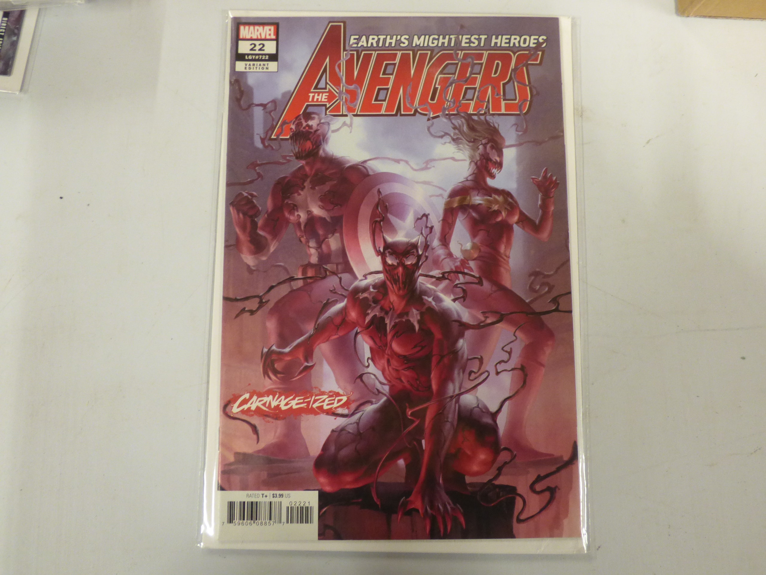 A Marvel “THE AVENGERS” comic book, issue #22, a red, purple, and gray “CARNAGE-IZED” variant edition, marked “EARTH’S MIGHTIEST HEROES”, “RATED T+”, and priced at $3.99 US.