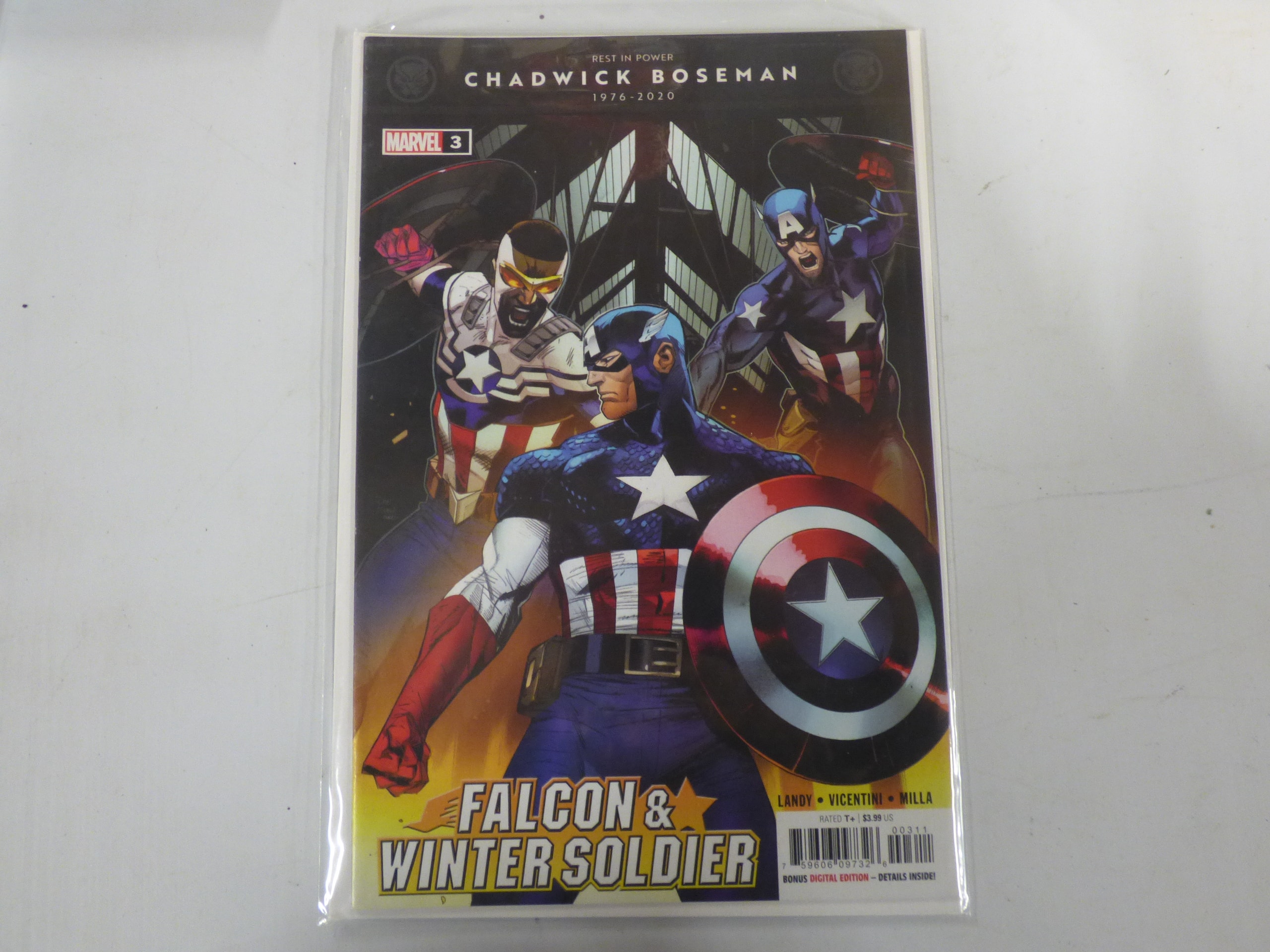 A single Marvel comic book, “Falcon & Winter Soldier” Issue 3, predominantly blue, white, and red, features “REST IN POWER CHADWICK BOSEMAN 1976-2020,” “MARVEL 3,” “LANDY • VICENTINI • MILLA, ” “RATED T+, ” “BONUS DIGITAL EDITION – DETAILS INSIDE!, ” and is priced at $3.99 US.