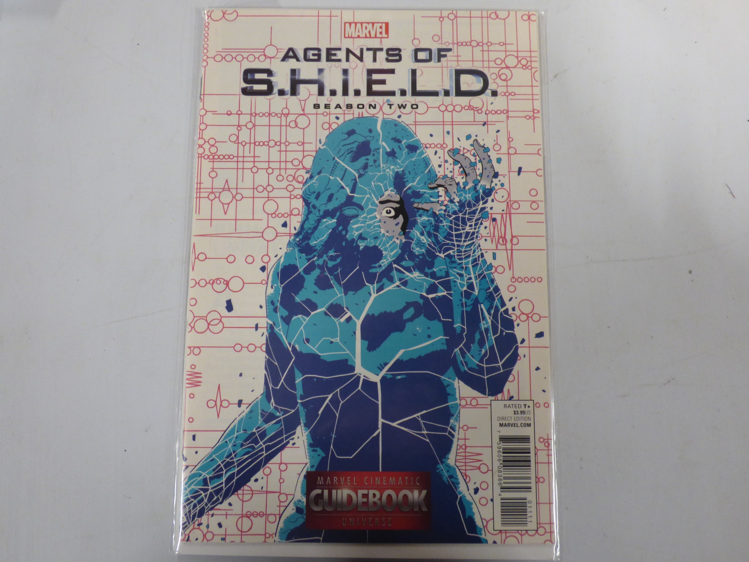 A comic book titled ‘MARVEL AGENTS OF S.H.I.E.L.D. SEASON TWO’ with ‘MARVEL CINEMATIC GUIDEBOOK UNIVERSE’, featuring a blue and purple shattered figure on an off-white background with red circuit-like lines, marked ‘RATED T+’, ‘DIRECT EDITION’, and ‘$3.99US’.