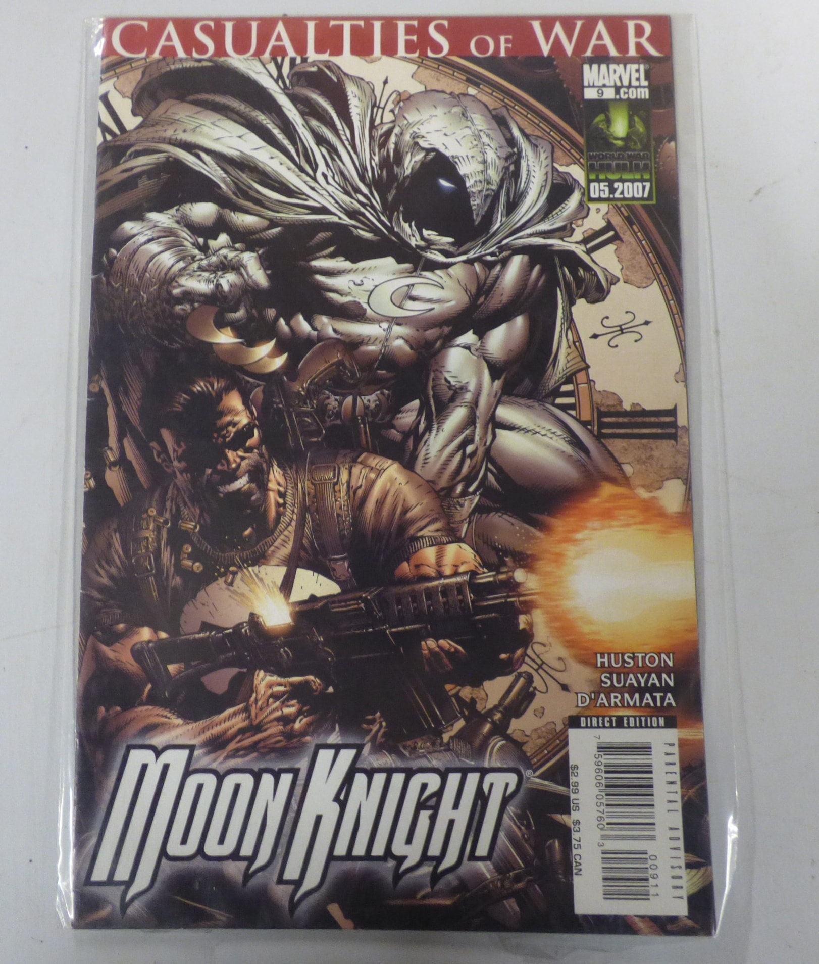 A brown, black, white, and orange Marvel comic book, ‘Moon Knight: Casualties of War’ from the ‘World War Hulk’ event, published May 2007, with creators Huston, Suayan, and D’Armata.