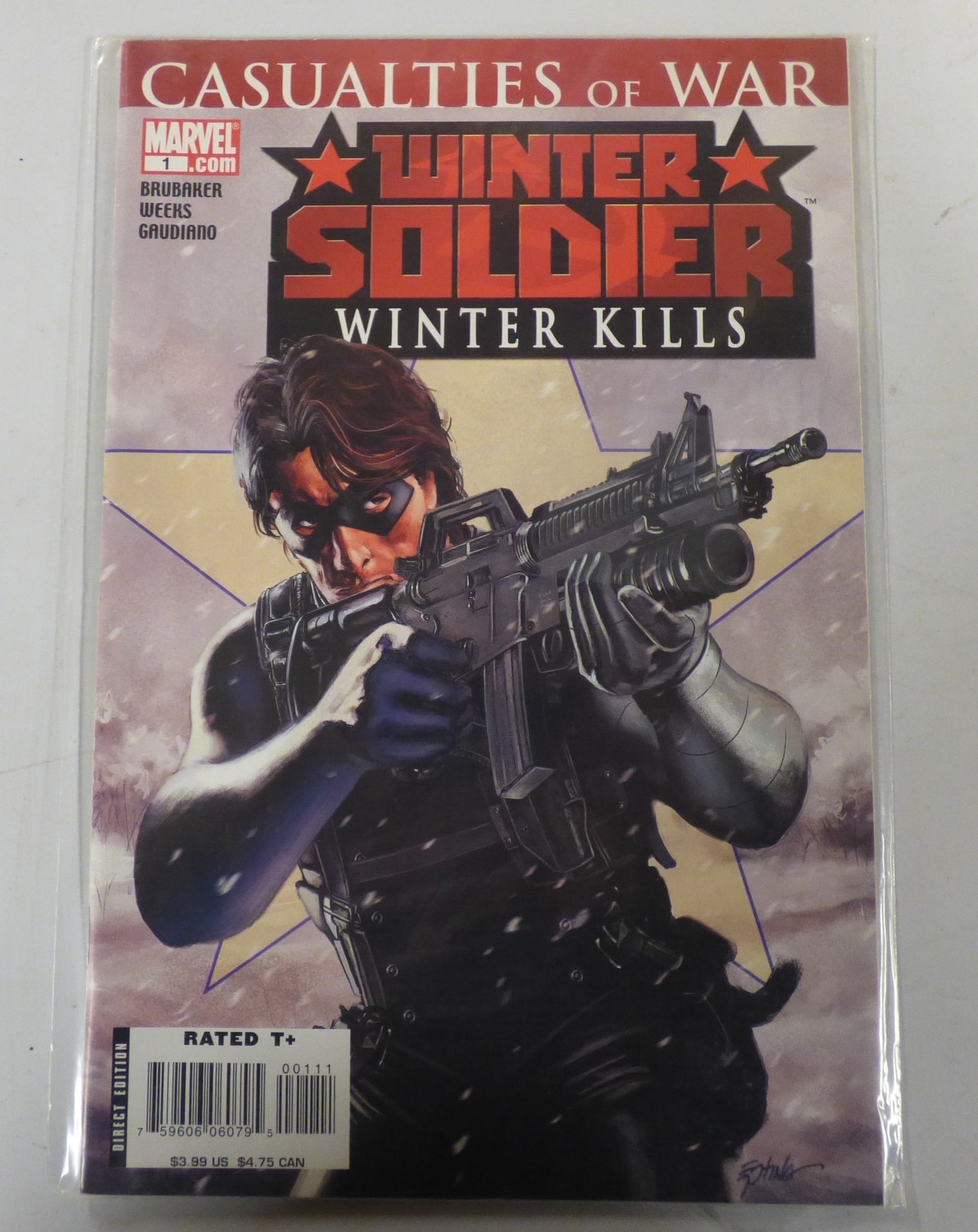 A Marvel comic book titled ‘CASUALTIES of WAR WINTER SOLDIER WINTER KILLS’ featuring a character in black and dark colors, with labels ‘MARVEL 1.com’, ‘BRUBAKER WEEKS GAUDIANO’, ‘RATED T+’, and ‘DIRECT EDITION’.