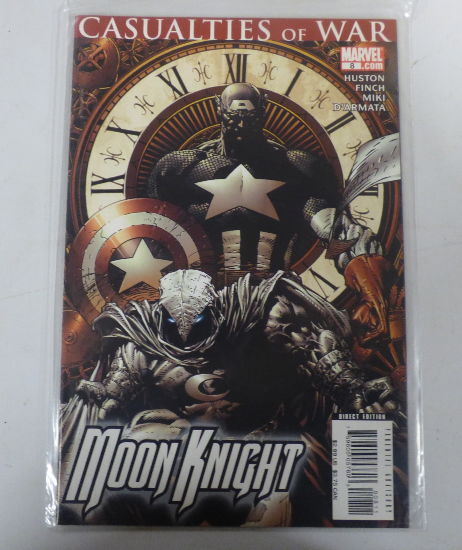 A multi-coloured comic book titled ‘CASUALTIES OF WAR’ and ‘MOON KNIGHT’ by MARVEL 8.com, featuring black, white, and brown artwork by HUSTON, FINCH, MIKI, and D’ARMATA, marked ‘DIRECT EDITION’ with a price of $2.99 US.