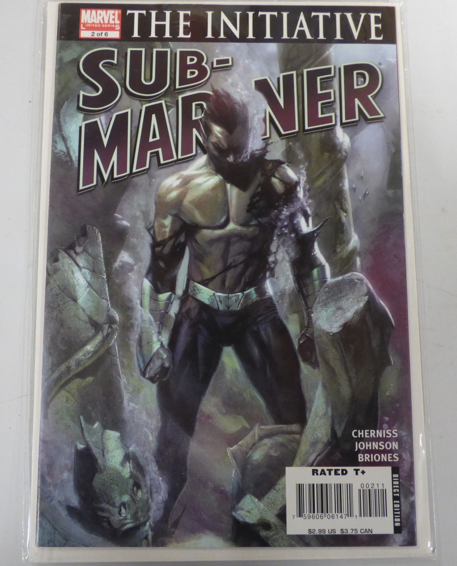 One Marvel comic book, ‘THE INITIATIVE SUB-MARINER’ (Limited Series, 2 of 6) with a dark blue, green, and purple cover, crediting Chernis, Johnson, and Briones, rated T+, Direct Edition, and priced at $2.99 US / $3.75 CAN.