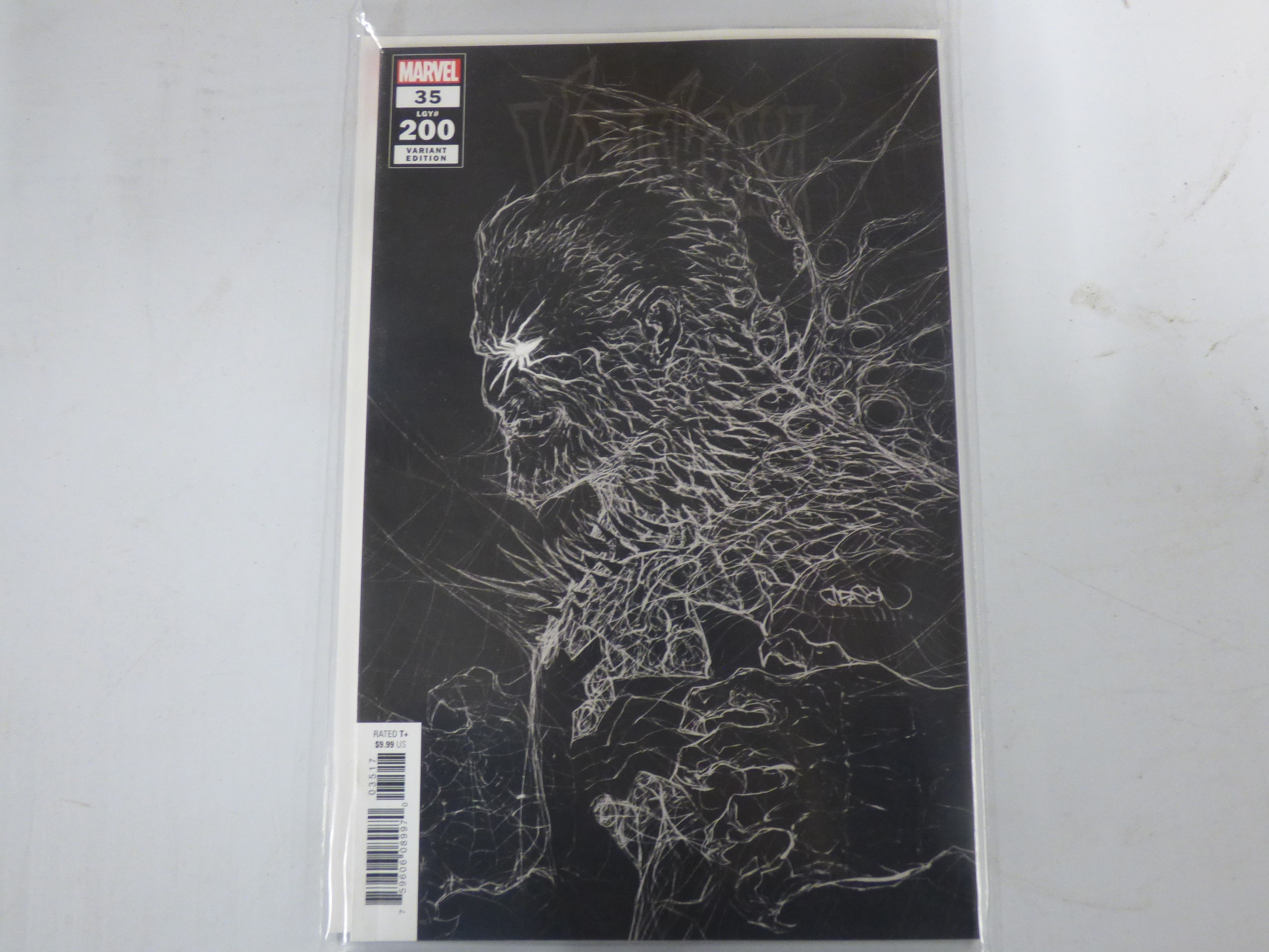 A Marvel comic book, MARVEL 35 LGY# 200 VARIANT EDITION, RATED T+, has a black cover with white line art of a monstrous figure and a spider symbol.