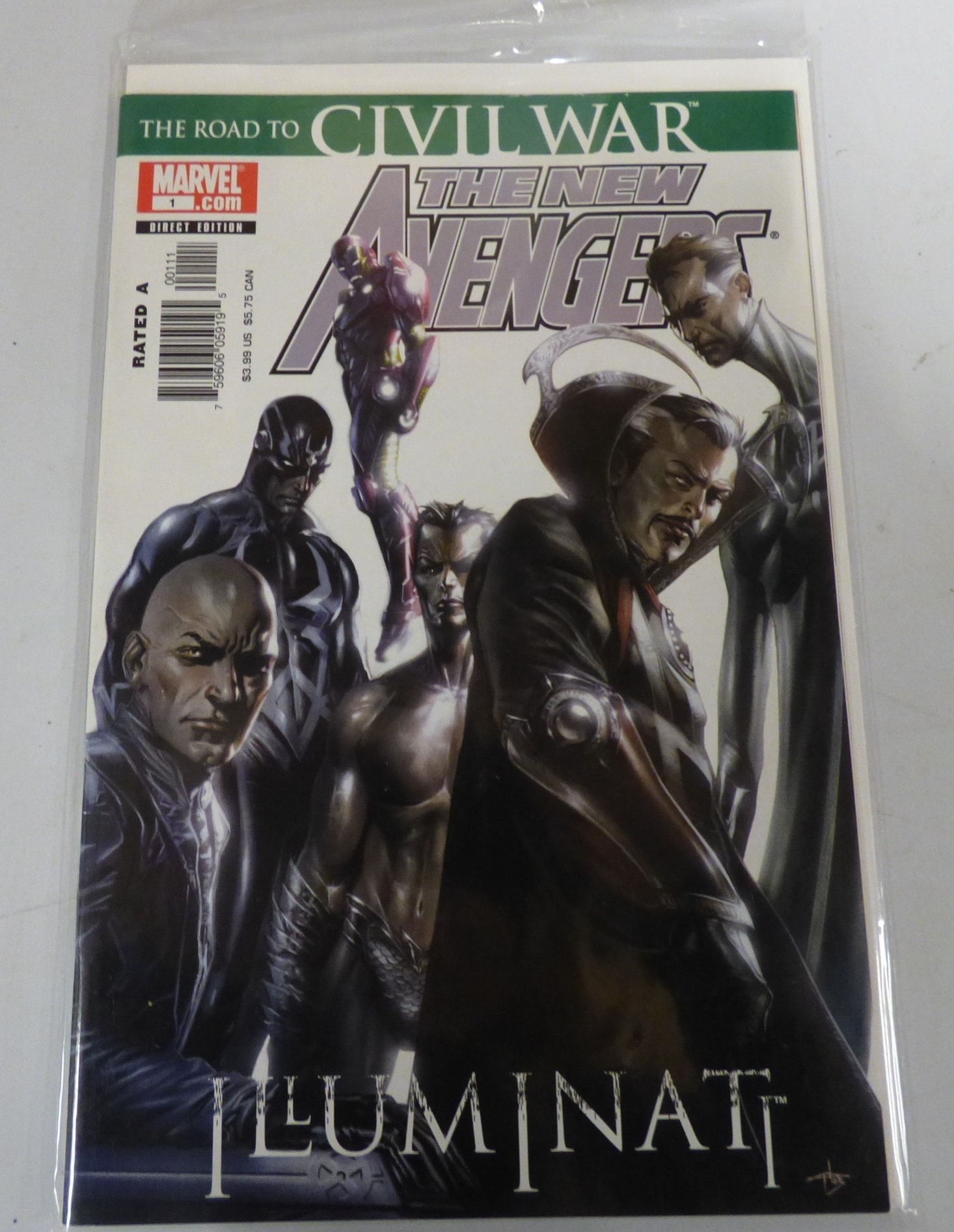 A multi-coloured Marvel comic book titled ‘THE ROAD TO CIVIL WAR THE NEW AVENGERS ILLUMINATI’, labelled ‘MARVEL 1 .COM DIRECT EDITION’ and ‘RATED A’.