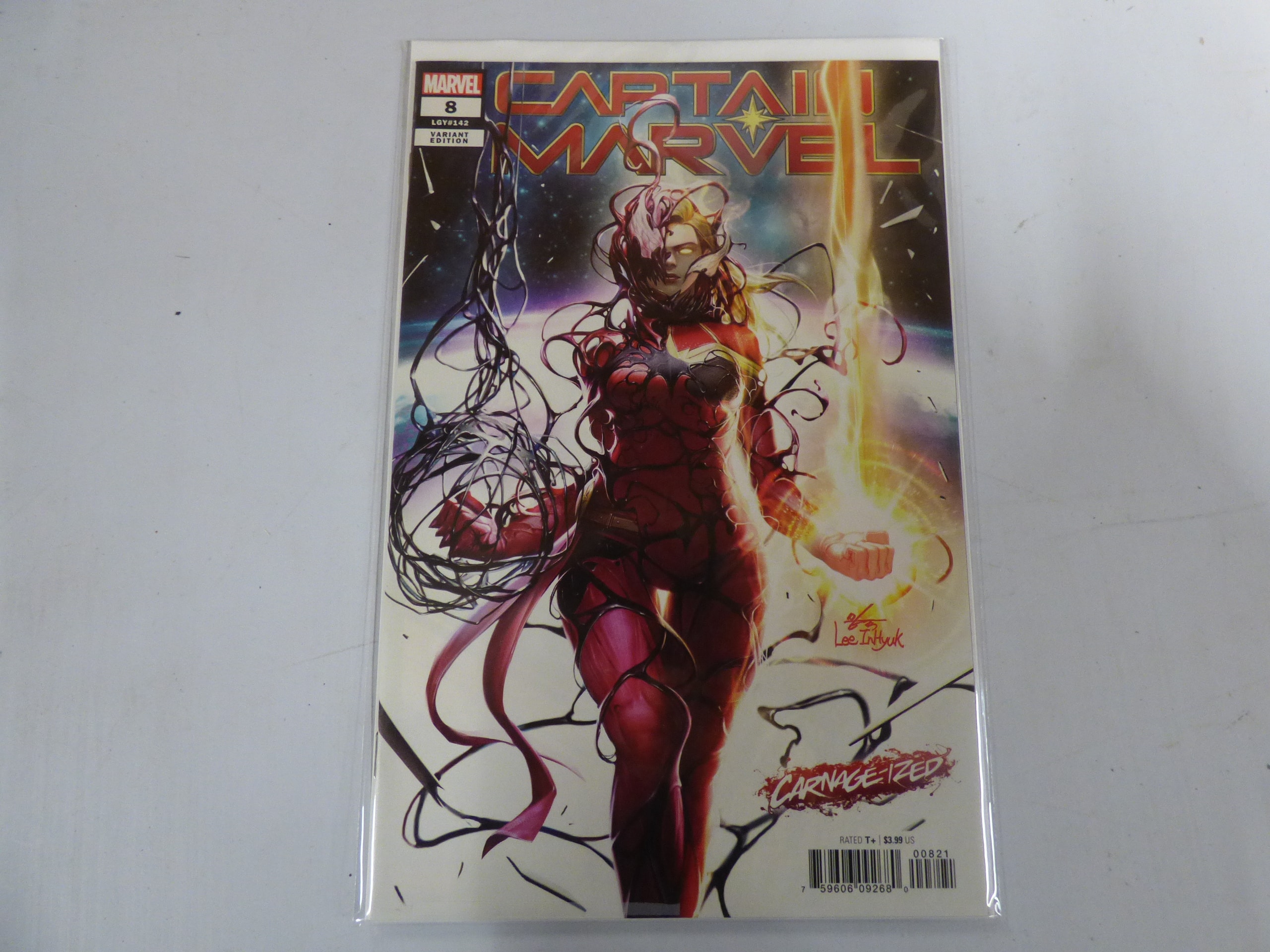 One Marvel “Captain Marvel” #8 (LGY#142) Variant Edition comic book, featuring a red and black “Carnage-ized” character on a cosmic cover, marked “RATED T+” and $3.99 US, noted for the 1st appearance of Star.