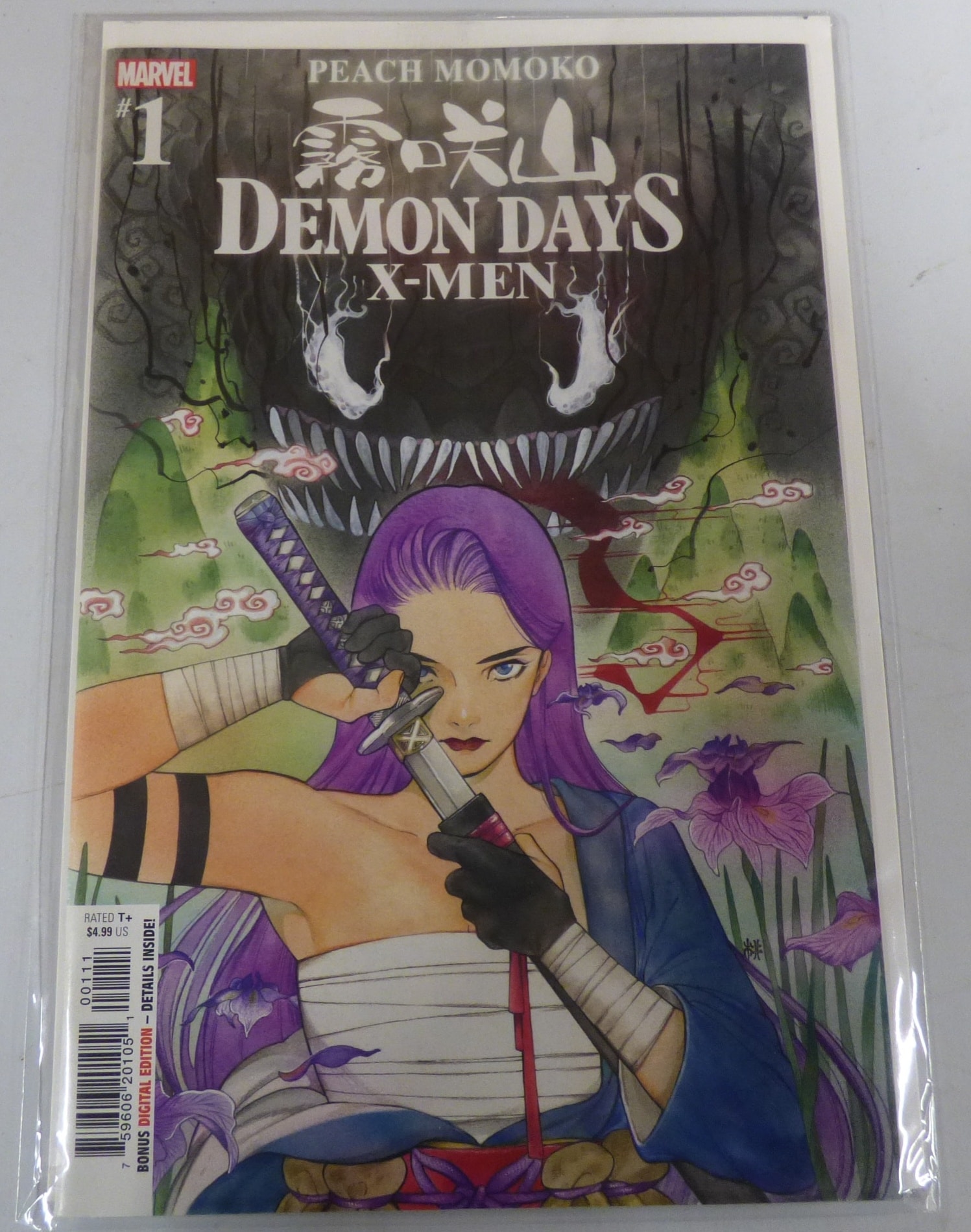 A comic book, ‘Marvel: Peach Momoko Demon Days X-Men #1,’ featuring a woman with purple hair and a sword on a colorful cover, marked ‘RATED T+’ and priced at $4.99 US, with ‘BONUS DIGITAL EDITION – DETAILS INSIDE!’ text and Japanese characters visible.