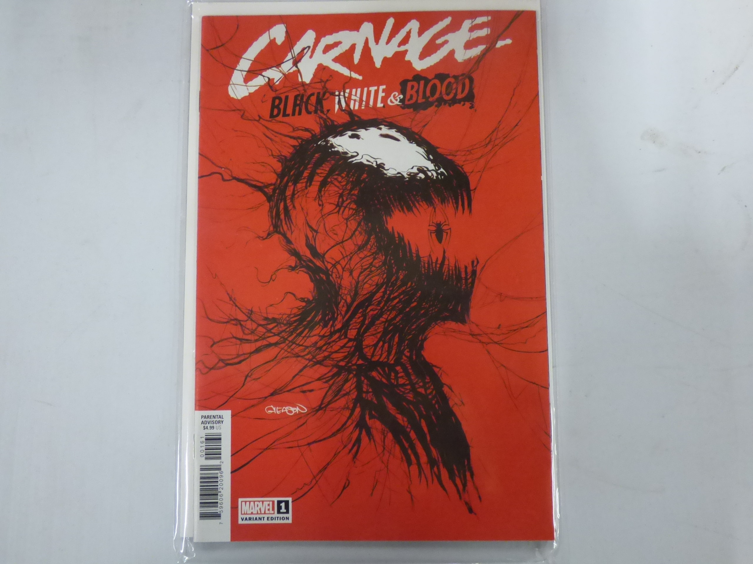 One red, black, and white Marvel Comics ‘CARNAGE BLACK, WHITE & BLOOD’ #1 Variant Edition comic book with a Parental Advisory, an apparent Gleason signature, and a $4.99 US price.