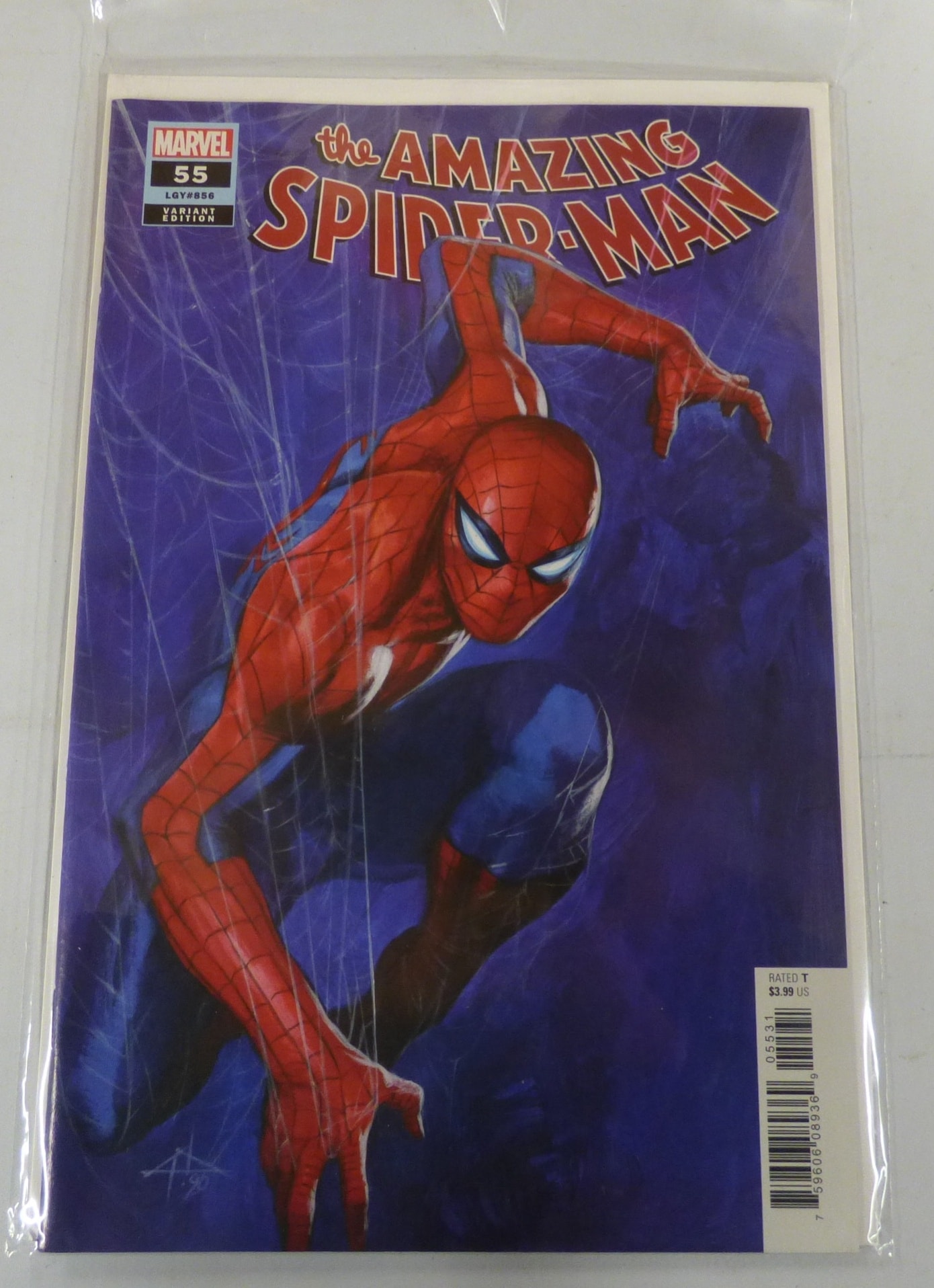A red, blue, and purple comic book titled “the AMAZING SPIDER-MAN” #55, a MARVEL VARIANT EDITION featuring Spider-Man, with visible text “LGY#856” and “RATED T”, originally priced at $3.99 US.