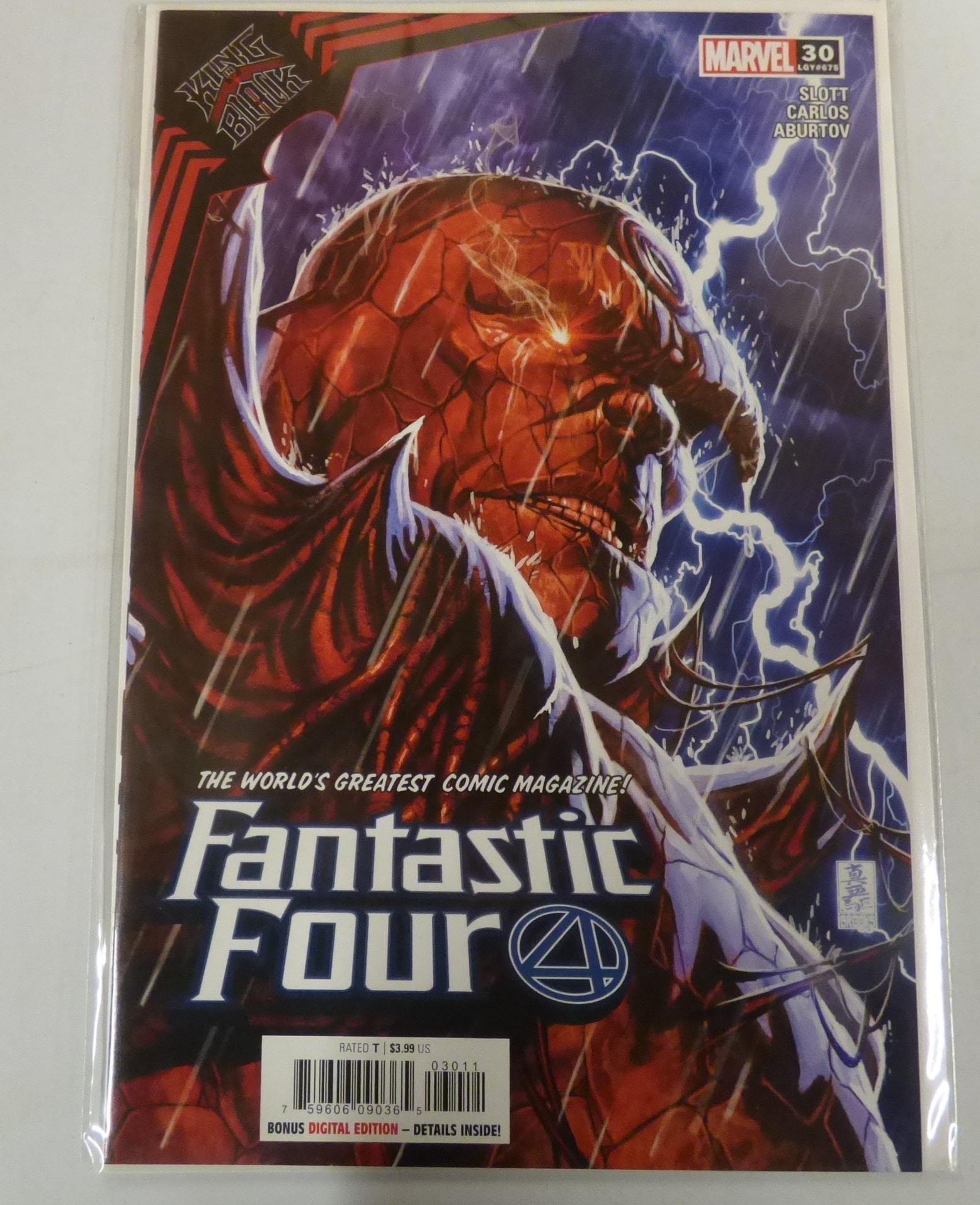 A Marvel Comics Fantastic Four issue 30 comic book, featuring an orange/red character against a blue/purple lightning background, labelled ‘KING BLACK’ and ‘SLOTT CARLOS ABURTOV’, priced at $3.99 US.