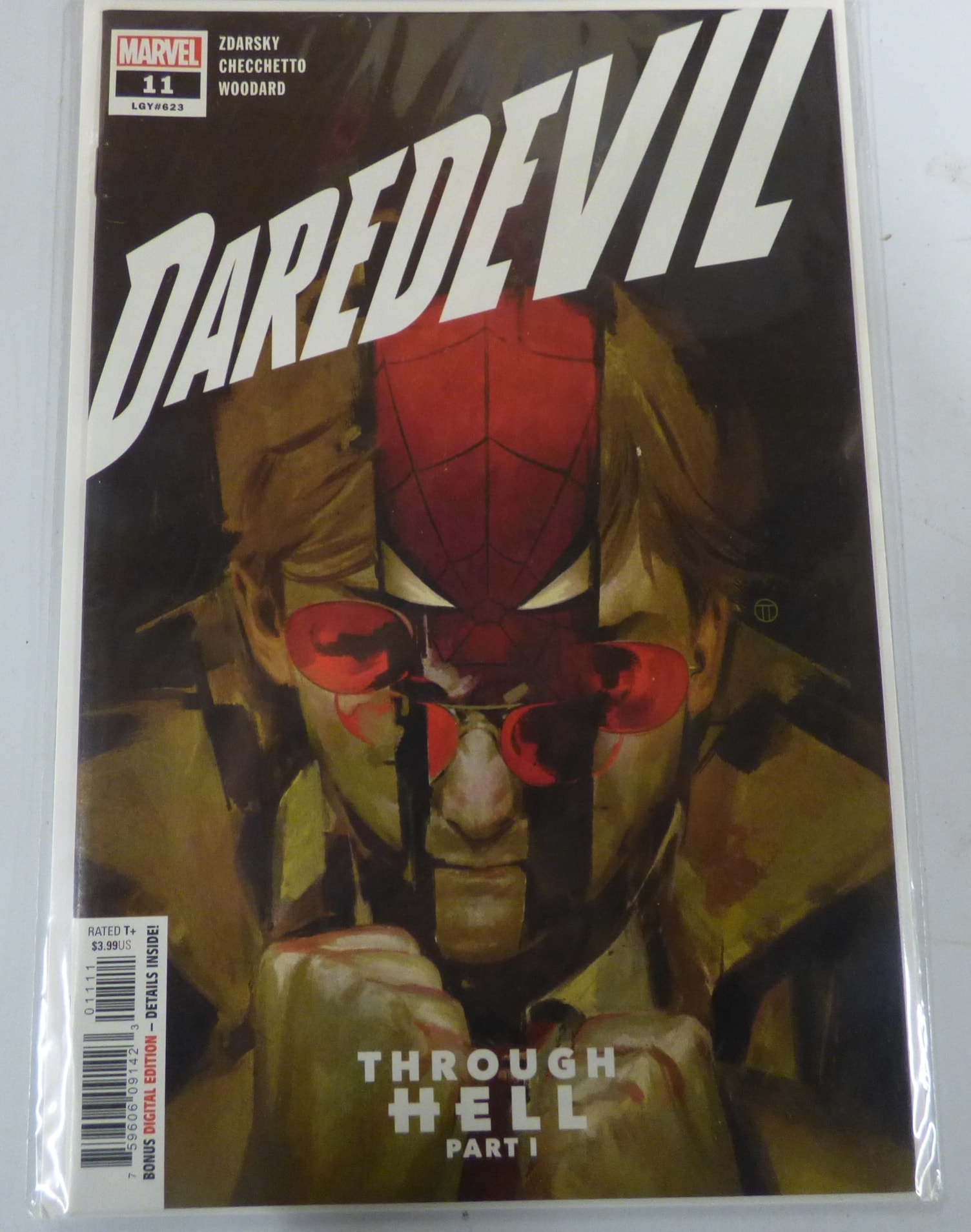 A single Marvel comic book, Daredevil #11, by Zdarsky, Checchetto, and Woodard, featuring a dark cover with red and yellow/brown tones, text ‘THROUGH HELL PART I’, ‘RATED T+’, and priced at $3.99US.