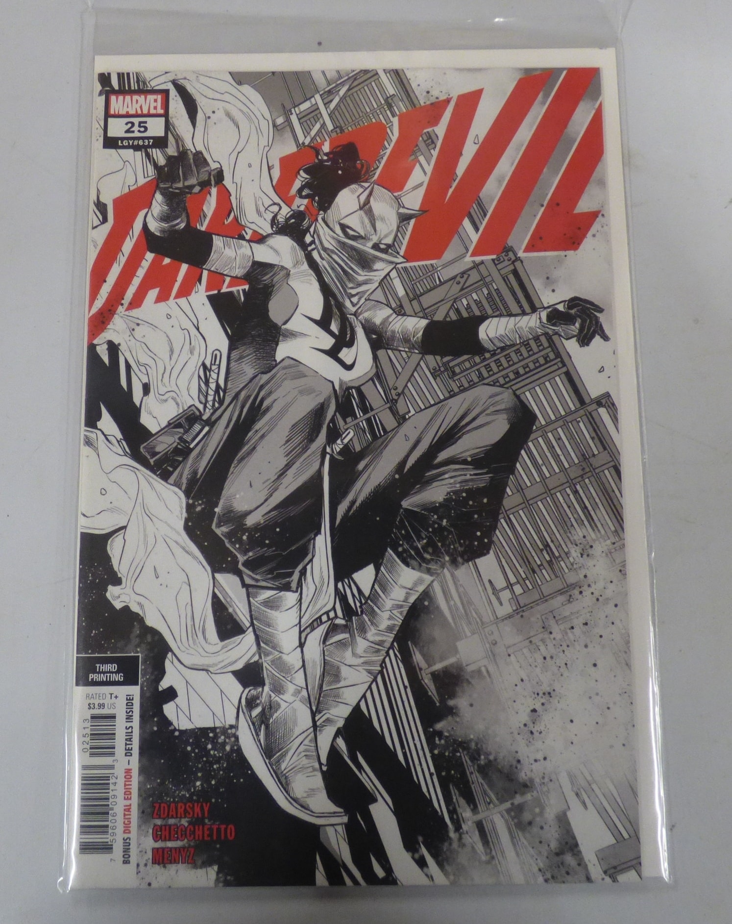 A black, white, and red Marvel Daredevil #25 (LGY#637) comic book, identified as a Third Printing, rated T+, priced at $3.99 US, with a bonus digital edition, credited to Zdarsky, Checchetto, and Meny.