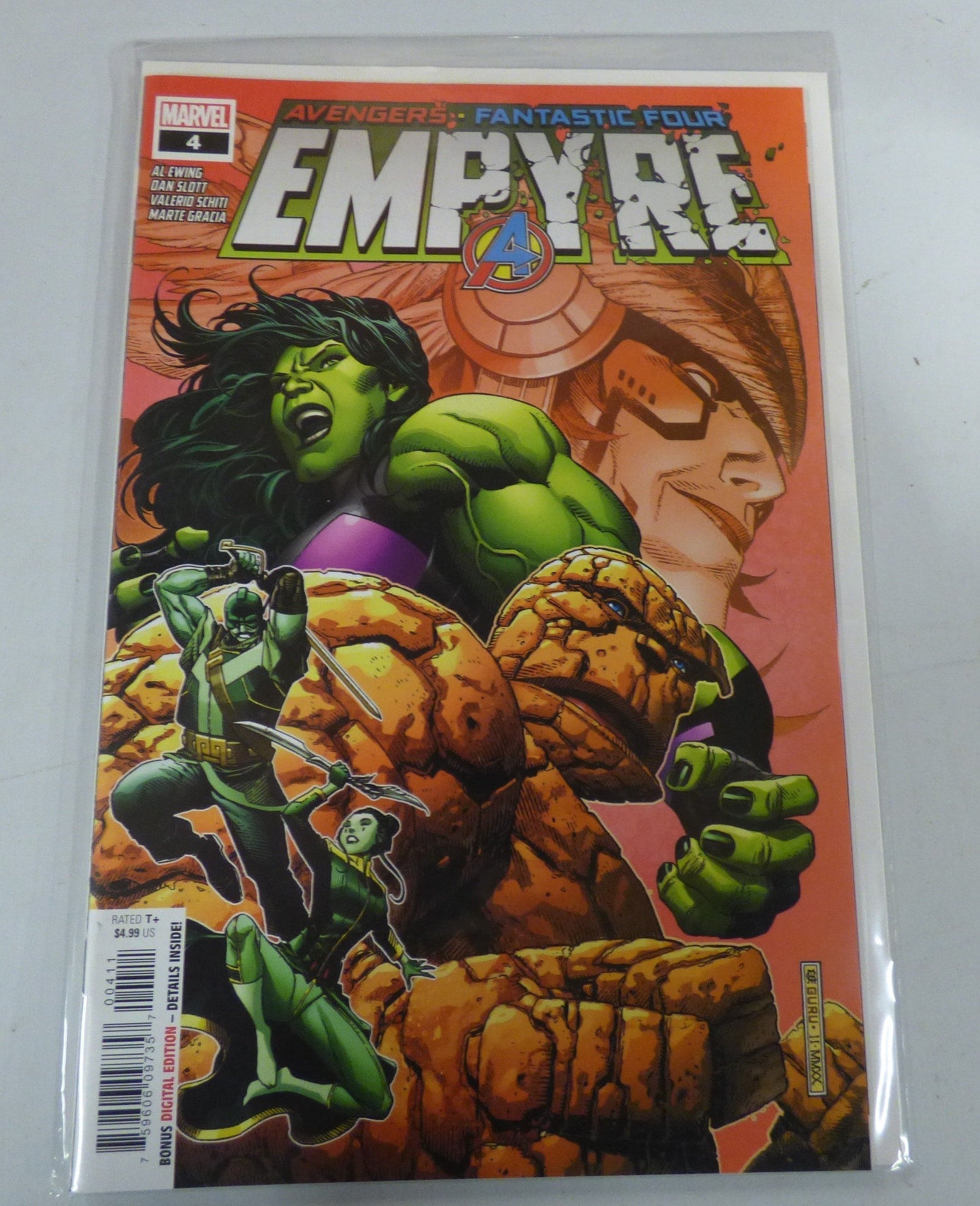 A Marvel comic book, “AVENGERS: FANTASTIC FOUR EMPYRE” issue #4, with a green, orange, and red cover featuring She-Hulk and The Thing, identified with text including AL EWING, DAN SLOTT, VALERIO SCHITI, and MARTE GRACIA.
