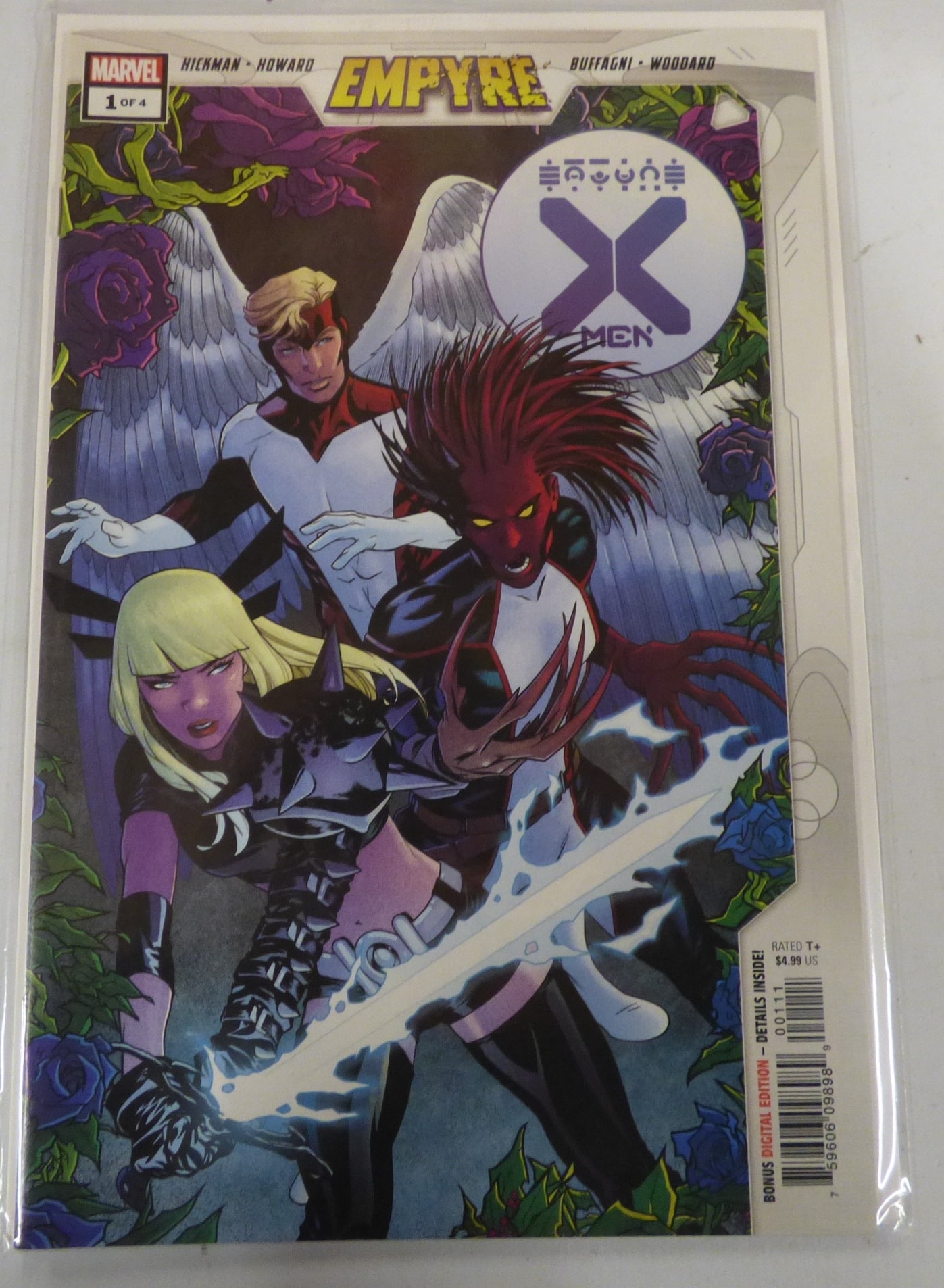 A Marvel comic book, ‘EMPYRE X MEN’ #1 of 4, featuring characters with white wings, red skin/hair, and purple/black outfits on a cover with purple and blue roses.