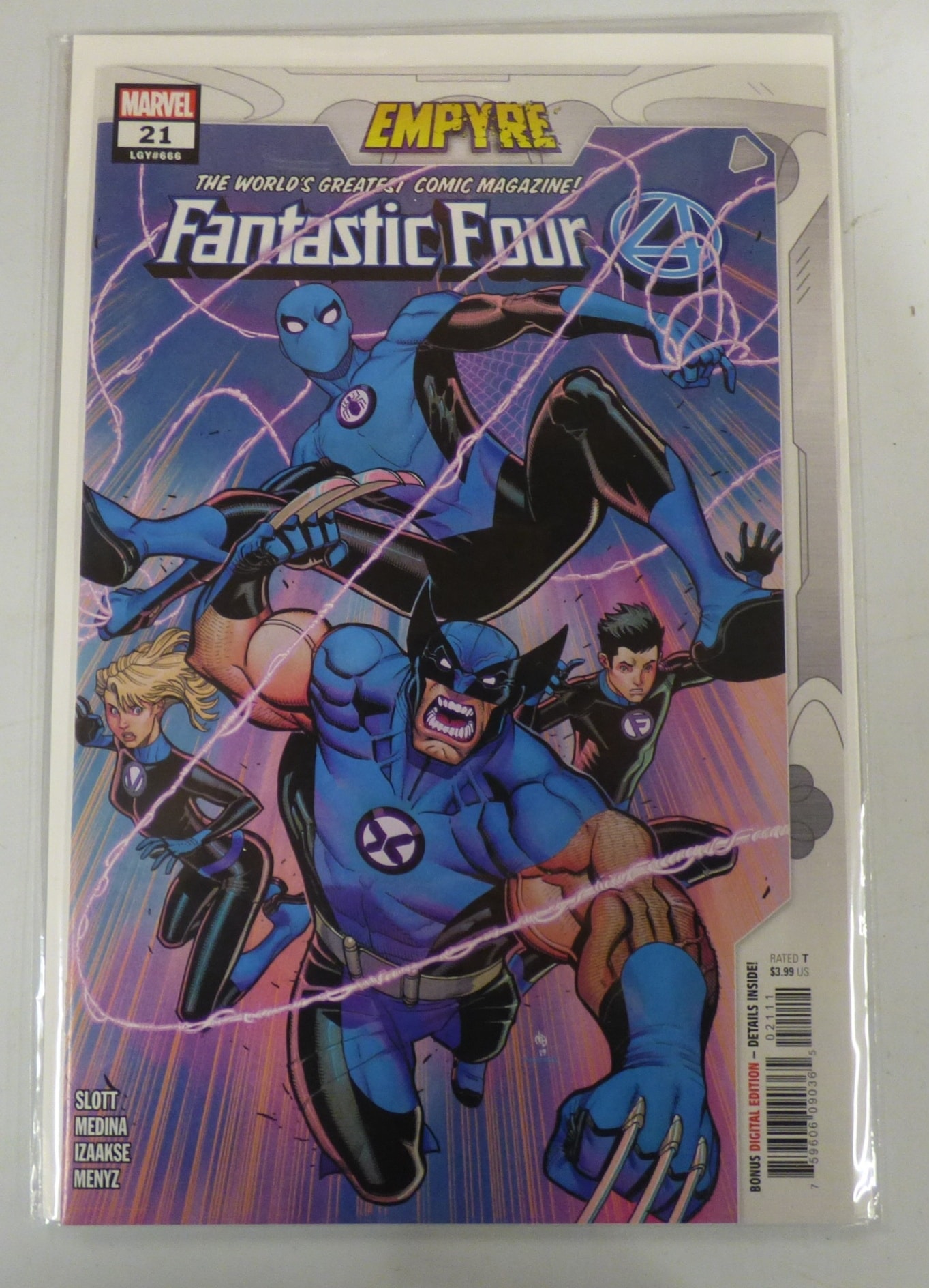 A Marvel comic book, “Fantastic Four” #21, featuring a blue, black, and purple cover with characters including Wolverine and Spider-Man, creator credits SLOTT, MEDINA, IZAAKSE, MENYZ, and priced at $3.99 US.
