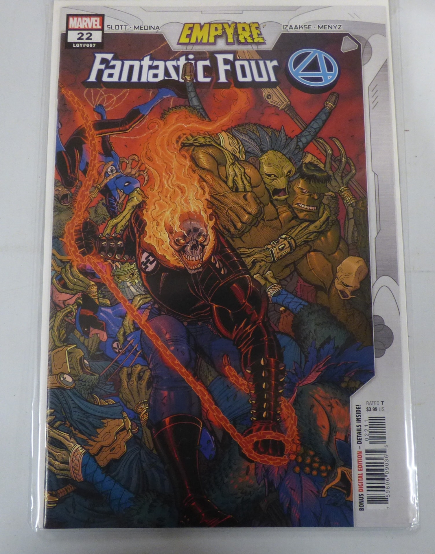 A multicoloured comic book, ‘Marvel Empyre Fantastic Four #22’, features Ghost Rider on the cover, marked ‘RATED T’ and priced at $3.99 US.