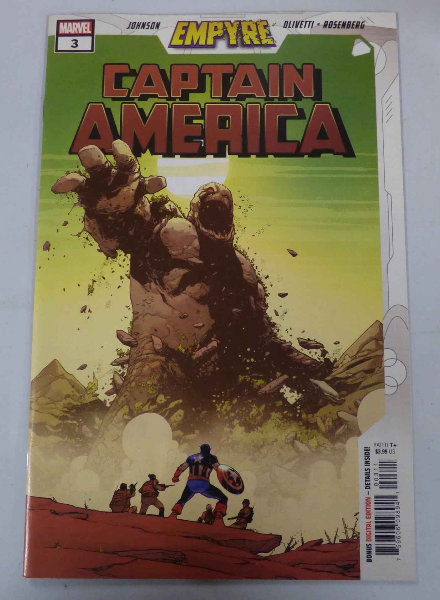A Marvel Comics Empyre Captain America issue #3 comic book featuring a green, yellow, and brown cover with Captain America, text ‘JOHNSON EMPYRE OLIVETTI ROSENBERG’, ‘BONUS DIGITAL EDITION – DETAILS INSIDE!’, ‘RATED T+’, and a $3.99 US price.