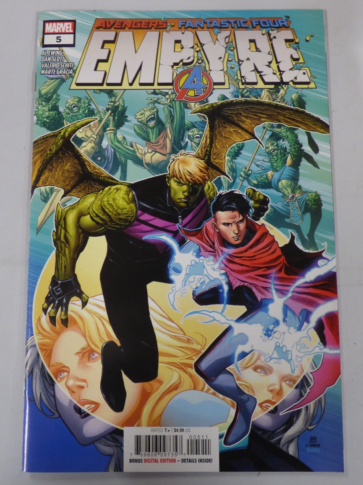One multi-coloured Marvel comic book, “AVENGERS FANTASTIC FOUR EMPYRE #5,” with credits by Al Ewing, Dan Slott, Valerio Schiti, and Marte Gracia, rated T+ and originally priced at $4.99 US.