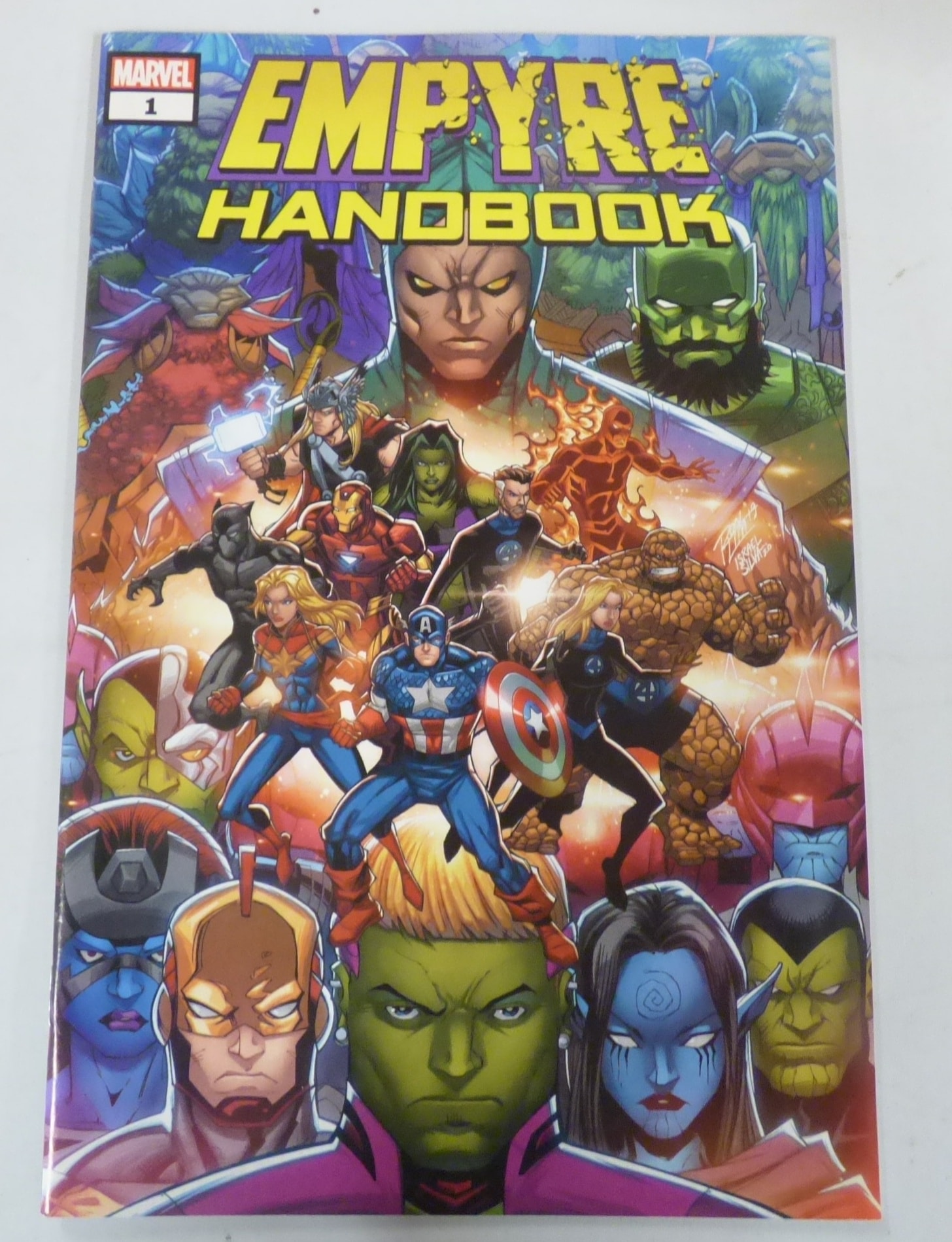 A multi-coloured Marvel comic book, ‘EMPYRE HANDBOOK’ issue #1, featuring various characters and signed by R.B. Silva and Israel Silva 2020.