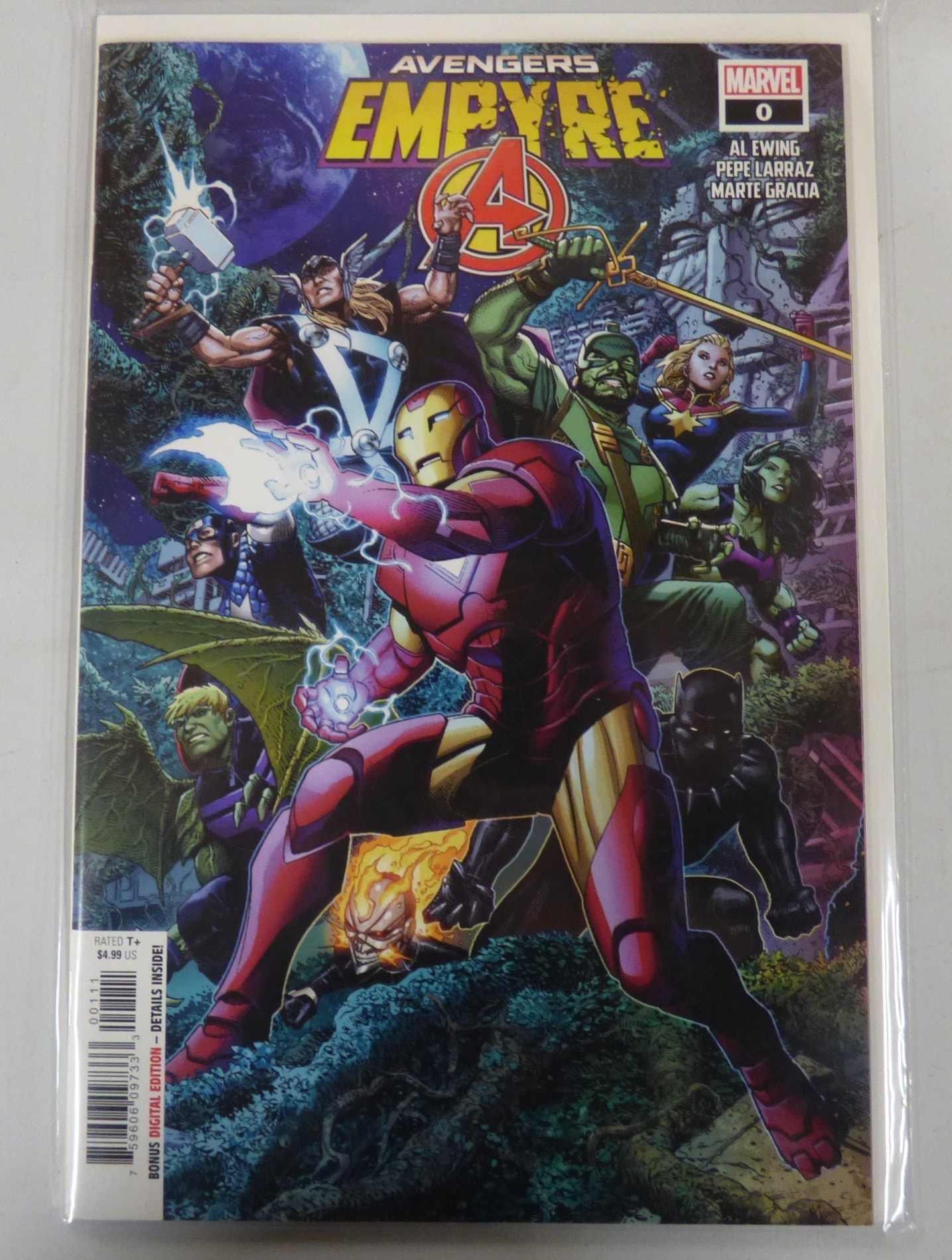 A multi-coloured Marvel comic book, “AVENGERS EMPYRE” #0, created by AL EWING, PEPE LARRAZ, MARTE GRACIA, rated T+, includes a bonus digital edition, and is priced at $4.99 US.